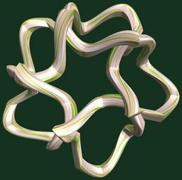 Keywords: mathematica 3d cg parametricplot3d texture torus code program algorithm tri-torus tritorus プログラム コード アルゴリズム 輪環 りんかん ドーナツ どーなつ 三芒星 さんぼうせい geometric sculpture geometricsculpture shape geometry sculpture mapping テクスチャ マッピング 模様 もよう abstract 抽象 ちゅうしょう アブストラクト design pattern デザイン パターン graphic グラフィック グラフィクス structure 意匠 構造 symmetry 対称性 たいしょうせい シンメトリー 対称 たいしょう black background curve indoor tangle a = 6; (* center hole size *) b = 3; (* tri-torus *) c = -3; (* distance from the center of rotation *) d = 5; (* number of torus *) h = 2; (* height of a torus *) SetOptions[ParametricPlot3D, PlotRange -> Full, Mesh -> None, Boxed -> False, Axes -> False, PlotPoints -> 400, ImageSize -> 3000, Background -> RGBColor[{20, 50, 30}/255], PlotStyle -> Directive[Specularity[White, 70], Texture[Import["D:/tmp/862.jpg"]]], TextureCoordinateFunction -> ({#4 + #5, #5 / Pi} &), Lighting -> "Neutral"]; f[v_] := TriangleWave[{-1, 1}, v/(2 Pi)]; g[v_] := TriangleWave[{-1, 1}, v/(2 Pi) + 1/4]; x = (a - g[t] - f[b s]) g[s] + c; y = (a - g[t] - f[b s]) f[s] + c; z = (a - Sin[t] - h Sin[b s]); rm = Table[{x, y, z}.RotationMatrix[2 i Pi/d, {1, 1, 1}], {i, d}]; ParametricPlot3D[rm, {t, 0, 2 Pi}, {s, 0, 2 Pi}] (*--- The Texture *) a = 6; (* center hole size *) b = 3; (* tri-torus *) c = -3; (* distance from the center of rotation *) d = 5; (* number of torus *) h = 2; (* height of a torus *) SetOptions[ParametricPlot3D, PlotRange -> Full, Mesh -> None, Boxed -> False, Axes -> False, PlotPoints -> 400, ImageSize -> 3000, Background -> RGBColor[{20, 50, 30}/255], PlotStyle -> Directive[Specularity[White, 70], Texture[Import["D:/tmp/862.jpg"]]], TextureCoordinateFunction -> ({#4 + #5, #5 / Pi} &), Lighting -> "Neutral"]; f[v_] := TriangleWave[{-1, 1}, v/(2 Pi)]; g[v_] := TriangleWave[{-1, 1}, v/(2 Pi) + 1/4]; x = (a - g[t] - f[b s]) g[s] + c; y = (a - g[t] - f[b s]) f[s] + c; z = (a - Sin[t] - h Sin[b s]); rm = Table[{x, y, z}.RotationMatrix[2 i Pi/d, {1, 1, 1}], {i, d}]; ParametricPlot3D[rm, {t, 0, 2 Pi}, {s, 0, 2 Pi}] (*--- The Texture *) |