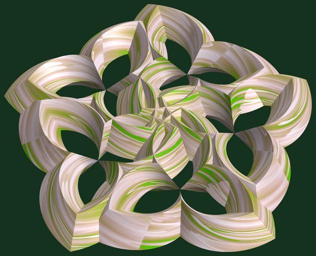 Keywords: mathematica 3d cg parametricplot3d texture torus code program algorithm tri-torus tritorus プログラム コード アルゴリズム 輪環 りんかん ドーナツ どーなつ 三芒星 さんぼうせい geometric sculpture geometricsculpture shape geometry sculpture mapping テクスチャ マッピング 模様 もよう abstract 抽象 ちゅうしょう アブストラクト design pattern デザイン パターン graphic グラフィック グラフィクス structure 意匠 構造 symmetry 対称性 たいしょうせい シンメトリー 対称 たいしょう pastel black background a = 2; (* center hole size *) b = 3; (* tri-torus *) c = 2; (* distance from the center of rotation *) d = 5; (* number of torus *) h = 0; (* height of a torus *) SetOptions[ParametricPlot3D, PlotRange -> Full, Mesh -> None, Boxed -> False, Axes -> False, PlotPoints -> 400, ImageSize -> 3000, Background -> RGBColor[{20, 50, 30}/255], PlotStyle -> Directive[Specularity[White, 50], Texture[Import["D:/tmp/862.jpg"]]], TextureCoordinateFunction -> ({#4 + #5, #5 / Pi} &), Lighting -> "Neutral"]; f[v_] := TriangleWave[{-1, 1}, v/(2 Pi)]; g[v_] := TriangleWave[{-1, 1}, v/(2 Pi) + 1/4]; x = (a - g[t] - f[b s]) Cos[s] + c; y = (a - g[t] - f[b s]) Sin[s] + c; z = (a - f[t] - h f[b s]); rm = Table[{x, y, z}.RotationMatrix[2 i Pi/d, {0, 0, 1}], {i, d}]; ParametricPlot3D[rm, {t, 0, 2 Pi}, {s, 0, Pi}] (*--- The Texture *) a = 2; (* center hole size *) b = 3; (* tri-torus *) c = 2; (* distance from the center of rotation *) d = 5; (* number of torus *) h = 0; (* height of a torus *) SetOptions[ParametricPlot3D, PlotRange -> Full, Mesh -> None, Boxed -> False, Axes -> False, PlotPoints -> 400, ImageSize -> 3000, Background -> RGBColor[{20, 50, 30}/255], PlotStyle -> Directive[Specularity[White, 50], Texture[Import["D:/tmp/862.jpg"]]], TextureCoordinateFunction -> ({#4 + #5, #5 / Pi} &), Lighting -> "Neutral"]; f[v_] := TriangleWave[{-1, 1}, v/(2 Pi)]; g[v_] := TriangleWave[{-1, 1}, v/(2 Pi) + 1/4]; x = (a - g[t] - f[b s]) Cos[s] + c; y = (a - g[t] - f[b s]) Sin[s] + c; z = (a - f[t] - h f[b s]); rm = Table[{x, y, z}.RotationMatrix[2 i Pi/d, {0, 0, 1}], {i, d}]; ParametricPlot3D[rm, {t, 0, 2 Pi}, {s, 0, Pi}] (*--- The Texture *) |