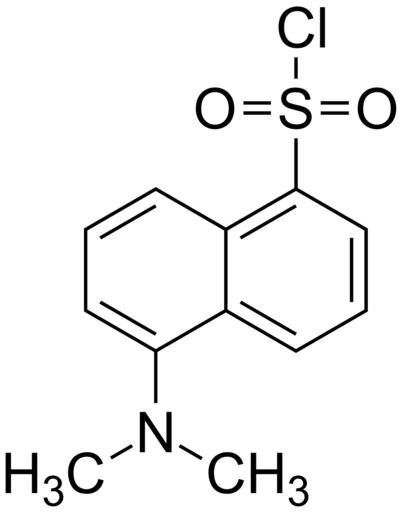 | Keywords: 5-(dimethylamino)naphthalene-1-sulfonyl chloride 200.svg validSVG Structure of 5- dimethylamino naphthalene-1-sulfonyl chloride Own 2014-05-13 Emeldir <span class signature-talk ></span> Chemical structure verified https //upload wikimedia org/wikipedia/commons/8/81/5- 28dimethylamino 29naphthalene-1-sulfonyl_chloride_200 svg 1S/C12H12ClNO2S/c1-14 2 11-7-3-6-10-9 11 5-4-8-12 10 17 13 15 16/h3-8H 1-2H3 XPDXVDYUQZHFPV-UHFFFAOYSA-N 605-65-2 Synonyms <small>1- Dimethylamino -5-naphthalenesulfonyl Chloride 1- Dimethylamino -5-naphthalenesulfonyl chloride 1-Dimethylaminonaphthalene-5-sulfonyl chloride 5-Dimethylaminonaphthalene-1-sulfonyl chloride 5-Dimethylamino-1-naphthalenesulfonyl chloride 5-dimethylaminonaphthalen-1-sulfonyl chloride Dansyl Chloride Dansyl chloride DNSCl N N-Dimethyl-1-naphthylamine-5-sulfonyl chloride</small> PD-chem Sulfonyl chlorides Naphthylamines Methyl compounds Tertiary amines |