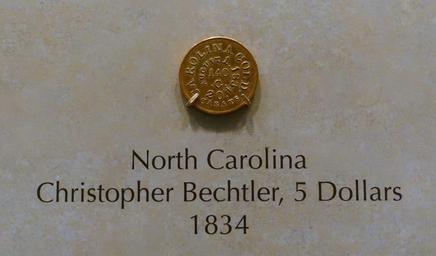 Keywords: 5 Dollars, Christopher Bechtler, North Carolina, 1834 - National Museum of American History - DSC00213.jpg en Exhibit in the National Museum of American History Washington DC USA Photography was permitted in the museum without restriction 2015-03-27 11 31 27 own Daderot other versions cc-zero Coins in the National Museum of American History Local currencies of the United States |