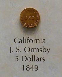 Keywords: 5 Dollars, J. S. Ormsby, California, 1849 - National Museum of American History - DSC00223.jpg en Exhibit in the National Museum of American History Washington DC USA Photography was permitted in the museum without restriction 2015-03-27 11 32 24 own Daderot other versions cc-zero Coins of the California Gold Rush in the National Museum of American History |