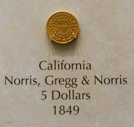Keywords: 5 Dollars, Norris, Gregg & Norris, California, 1849 - National Museum of American History - DSC00220.jpg en Exhibit in the National Museum of American History Washington DC USA Photography was permitted in the museum without restriction 2015-03-27 11 32 09 own Daderot other versions cc-zero Coins of the California Gold Rush in the National Museum of American History |