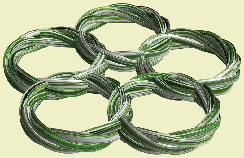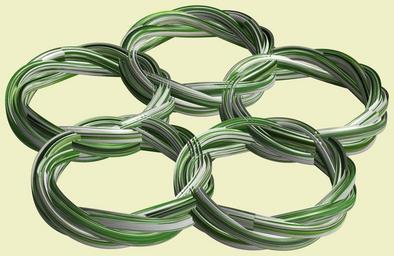 Keywords: mathematica 3d cg parametricplot3d texture torus code program algorithm プログラム コード アルゴリズム 輪環 りんかん ドーナツ どーなつ トーラス とーらす knot 結び目 むすびめ mapping テクスチャ マッピング 模様 もよう design pattern デザイン パターン graphic グラフィック グラフィクス structure 意匠 構造 symmetry 対称性 たいしょうせい シンメトリー 対称 たいしょう indoor white background drawing cable a = 13; (* center hole size of a torus *) b1 = 9;(* the number of angles *) b2 = 4;(* the number of waves *) b3 = 4; (* the number of knots *) c = 14; (* distance from the center of rotation *) d = 5; (* the number of tori *) h1 = 1; (* width of a torus *) h2 = 1; (* width of a torus *) h3 = 2; (* height of cross *) SetOptions[ParametricPlot3D, PlotRange -> Full, Mesh -> None, Boxed -> False, Axes -> None, PlotPoints -> 500, ImageSize -> 3000, Background -> RGBColor[{240, 240, 200}/255], PlotStyle -> Directive[Specularity[White, 50], Texture[Import["D:/tmp/911.jpg"]]], TextureCoordinateFunction -> ({#4, #5 /Pi} &), Lighting -> "Neutral"]; x = (a - h1 Cos[t] + h2 Sin[b1 s]) Cos[b3 s] + c; y = (a - h1 Cos[t] + h2 Sin[b1 s]) Sin[b3 s] + c; z = h3 Cos[b1 s] + Sin[b2 t] + c; rm = Table[{x, y, z}.RotationMatrix[2 i Pi/d, {0, 0, 1}], {i, d}]; ParametricPlot3D[rm, {t, 0, 2 Pi}, {s, 0, 2 Pi}] (*--- The Texture *) a = 13; (* center hole size of a torus *) b1 = 9;(* the number of angles *) b2 = 4;(* the number of waves *) b3 = 4; (* the number of knots *) c = 14; (* distance from the center of rotation *) d = 5; (* the number of tori *) h1 = 1; (* width of a torus *) h2 = 1; (* width of a torus *) h3 = 2; (* height of cross *) SetOptions[ParametricPlot3D, PlotRange -> Full, Mesh -> None, Boxed -> False, Axes -> None, PlotPoints -> 500, ImageSize -> 3000, Background -> RGBColor[{240, 240, 200}/255], PlotStyle -> Directive[Specularity[White, 50], Texture[Import["D:/tmp/911.jpg"]]], TextureCoordinateFunction -> ({#4, #5 /Pi} &), Lighting -> "Neutral"]; x = (a - h1 Cos[t] + h2 Sin[b1 s]) Cos[b3 s] + c; y = (a - h1 Cos[t] + h2 Sin[b1 s]) Sin[b3 s] + c; z = h3 Cos[b1 s] + Sin[b2 t] + c; rm = Table[{x, y, z}.RotationMatrix[2 i Pi/d, {0, 0, 1}], {i, d}]; ParametricPlot3D[rm, {t, 0, 2 Pi}, {s, 0, 2 Pi}] (*--- The Texture *) |