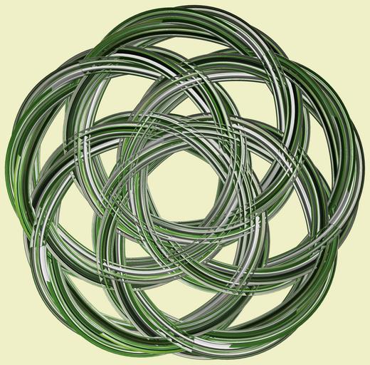 Keywords: mathematica 3d cg parametricplot3d texture torus code program algorithm プログラム コード アルゴリズム 輪環 りんかん ドーナツ どーなつ トーラス とーらす knot 結び目 むすびめ mapping テクスチャ マッピング 模様 もよう design pattern デザイン パターン graphic グラフィック グラフィクス structure 意匠 構造 symmetry 対称性 たいしょうせい シンメトリー 対称 たいしょう cable drawing indoor round circle white background a = 13; (* center hole size of a torus *) b1 = 9;(* the number of angles *) b2 = 4;(* the number of waves *) b3 = 4; (* the number of knots *) c = 5; (* distance from the center of rotation *) d = 5; (* the number of tori *) h1 = 1; (* width of a torus *) h2 = 1; (* width of a torus *) h3 = 2; (* height of cross *) SetOptions[ParametricPlot3D, PlotRange -> Full, Mesh -> None, Boxed -> False, Axes -> None, PlotPoints -> 500, ImageSize -> 3000, Background -> RGBColor[{240, 240, 200}/255], PlotStyle -> Directive[Specularity[White, 50], Texture[Import["D:/tmp/911.jpg"]]], TextureCoordinateFunction -> ({#4, #5 /Pi} &), Lighting -> "Neutral"]; x = (a - h1 Cos[t] + h2 Sin[b1 s]) Cos[b3 s] + c; y = (a - h1 Cos[t] + h2 Sin[b1 s]) Sin[b3 s] + c; z = h3 Cos[b1 s] + Sin[b2 t] + c; rm = Table[{x, y, z}.RotationMatrix[2 i Pi/d, {0, 0, 1}], {i, d}]; ParametricPlot3D[rm, {t, 0, 2 Pi}, {s, 0, 2 Pi}] (*--- The Texture *) a = 13; (* center hole size of a torus *) b1 = 9;(* the number of angles *) b2 = 4;(* the number of waves *) b3 = 4; (* the number of knots *) c = 5; (* distance from the center of rotation *) d = 5; (* the number of tori *) h1 = 1; (* width of a torus *) h2 = 1; (* width of a torus *) h3 = 2; (* height of cross *) SetOptions[ParametricPlot3D, PlotRange -> Full, Mesh -> None, Boxed -> False, Axes -> None, PlotPoints -> 500, ImageSize -> 3000, Background -> RGBColor[{240, 240, 200}/255], PlotStyle -> Directive[Specularity[White, 50], Texture[Import["D:/tmp/911.jpg"]]], TextureCoordinateFunction -> ({#4, #5 /Pi} &), Lighting -> "Neutral"]; x = (a - h1 Cos[t] + h2 Sin[b1 s]) Cos[b3 s] + c; y = (a - h1 Cos[t] + h2 Sin[b1 s]) Sin[b3 s] + c; z = h3 Cos[b1 s] + Sin[b2 t] + c; rm = Table[{x, y, z}.RotationMatrix[2 i Pi/d, {0, 0, 1}], {i, d}]; ParametricPlot3D[rm, {t, 0, 2 Pi}, {s, 0, 2 Pi}] (*--- The Texture *) |