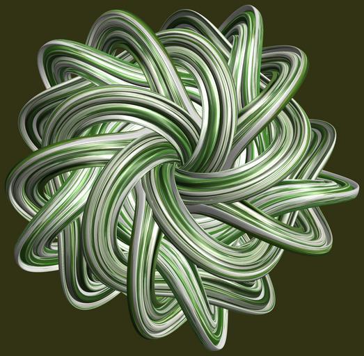 Keywords: mathematica 3d cg parametricplot3d texture torus code program algorithm プログラム コード アルゴリズム 輪環 りんかん ドーナツ どーなつ トーラス とーらす knot 結び目 むすびめ mapping テクスチャ マッピング 模様 もよう design pattern デザイン パターン graphic グラフィック グラフィクス structure 意匠 構造 symmetry 対称性 たいしょうせい シンメトリー 対称 たいしょう drawing indoor tangle a = 14; (* center hole size of a torus *) b1 = 7; (* the number of angles *) b2 = 4; (* the number of waves *) b3 = 3; (* the number of knots *) c = 8; (* distance from the center of rotation *) d = 5; (* the number of tori *) h1 = 3; (* width of a torus *) h2 = 4; (* width of a torus *) h3 = 5; (* height of cross *) SetOptions[ParametricPlot3D, PlotRange -> Full, Mesh -> None, Boxed -> False, Axes -> None, PlotPoints -> 500, ImageSize -> 3000, Background -> RGBColor[{50, 50, 20}/255], PlotStyle -> Directive[Specularity[White, 50], Texture[Import["D:/tmp/911.jpg"]]], TextureCoordinateFunction -> ({#4, #5 /Pi} &), Lighting -> "Neutral"]; x = (a - h1 Cos[t] + h2 Sin[b1 s]) Cos[b3 s] + c; y = (a - h1 Cos[t] + h2 Sin[b1 s]) Sin[b3 s] + c; z = h3 Cos[b1 s] + Sin[b2 t] + c; rm = Table[{x, y, z}.RotationMatrix[2 i Pi/d, {1, 0, 1}], {i, d}]; ParametricPlot3D[rm, {t, 0, 2 Pi}, {s, 0, 2 Pi}] (*--- The Texture *) a = 14; (* center hole size of a torus *) b1 = 7; (* the number of angles *) b2 = 4; (* the number of waves *) b3 = 3; (* the number of knots *) c = 8; (* distance from the center of rotation *) d = 5; (* the number of tori *) h1 = 3; (* width of a torus *) h2 = 4; (* width of a torus *) h3 = 5; (* height of cross *) SetOptions[ParametricPlot3D, PlotRange -> Full, Mesh -> None, Boxed -> False, Axes -> None, PlotPoints -> 500, ImageSize -> 3000, Background -> RGBColor[{50, 50, 20}/255], PlotStyle -> Directive[Specularity[White, 50], Texture[Import["D:/tmp/911.jpg"]]], TextureCoordinateFunction -> ({#4, #5 /Pi} &), Lighting -> "Neutral"]; x = (a - h1 Cos[t] + h2 Sin[b1 s]) Cos[b3 s] + c; y = (a - h1 Cos[t] + h2 Sin[b1 s]) Sin[b3 s] + c; z = h3 Cos[b1 s] + Sin[b2 t] + c; rm = Table[{x, y, z}.RotationMatrix[2 i Pi/d, {1, 0, 1}], {i, d}]; ParametricPlot3D[rm, {t, 0, 2 Pi}, {s, 0, 2 Pi}] (*--- The Texture *) |