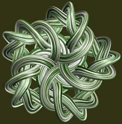 Keywords: mathematica 3d cg parametricplot3d texture torus code program algorithm プログラム コード アルゴリズム 輪環 りんかん ドーナツ どーなつ トーラス とーらす knot 結び目 むすびめ mapping テクスチャ マッピング 模様 もよう design pattern デザイン パターン graphic グラフィック グラフィクス structure 意匠 構造 symmetry 対称性 たいしょうせい シンメトリー 対称 たいしょう tangle indoor drawing a = 14; (* center hole size of a torus *) b1 = 7; (* the number of angles *) b2 = 4; (* the number of waves *) b3 = 3; (* the number of knots *) c = 14; (* distance from the center of rotation *) d = 5; (* the number of tori *) h1 = 3; (* width of a torus *) h2 = 4; (* width of a torus *) h3 = 5; (* height of cross *) SetOptions[ParametricPlot3D, PlotRange -> Full, Mesh -> None, Boxed -> False, Axes -> None, PlotPoints -> 500, ImageSize -> 3000, Background -> RGBColor[{50, 50, 20}/255], PlotStyle -> Directive[Specularity[White, 50], Texture[Import["D:/tmp/911.jpg"]]], TextureCoordinateFunction -> ({#4, #5 /Pi} &), Lighting -> "Neutral"]; x = (a - h1 Cos[t] + h2 Sin[b1 s]) Cos[b3 s] + c; y = (a - h1 Cos[t] + h2 Sin[b1 s]) Sin[b3 s] + c; z = h3 Cos[b1 s] + Sin[b2 t] + c; rm = Table[{x, y, z}.RotationMatrix[2 i Pi/d, {1, 0, 1}], {i, d}]; ParametricPlot3D[rm, {t, 0, 2 Pi}, {s, 0, 2 Pi}] (*--- The Texture *) a = 14; (* center hole size of a torus *) b1 = 7; (* the number of angles *) b2 = 4; (* the number of waves *) b3 = 3; (* the number of knots *) c = 14; (* distance from the center of rotation *) d = 5; (* the number of tori *) h1 = 3; (* width of a torus *) h2 = 4; (* width of a torus *) h3 = 5; (* height of cross *) SetOptions[ParametricPlot3D, PlotRange -> Full, Mesh -> None, Boxed -> False, Axes -> None, PlotPoints -> 500, ImageSize -> 3000, Background -> RGBColor[{50, 50, 20}/255], PlotStyle -> Directive[Specularity[White, 50], Texture[Import["D:/tmp/911.jpg"]]], TextureCoordinateFunction -> ({#4, #5 /Pi} &), Lighting -> "Neutral"]; x = (a - h1 Cos[t] + h2 Sin[b1 s]) Cos[b3 s] + c; y = (a - h1 Cos[t] + h2 Sin[b1 s]) Sin[b3 s] + c; z = h3 Cos[b1 s] + Sin[b2 t] + c; rm = Table[{x, y, z}.RotationMatrix[2 i Pi/d, {1, 0, 1}], {i, d}]; ParametricPlot3D[rm, {t, 0, 2 Pi}, {s, 0, 2 Pi}] (*--- The Texture *) |