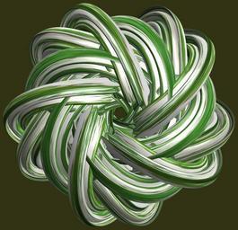 Keywords: mathematica 3d cg parametricplot3d texture torus code program algorithm プログラム コード アルゴリズム 輪環 りんかん ドーナツ どーなつ トーラス とーらす knot 結び目 むすびめ mapping テクスチャ マッピング 模様 もよう design pattern デザイン パターン graphic グラフィック グラフィクス structure 意匠 構造 symmetry 対称性 たいしょうせい シンメトリー 対称 たいしょう indoor black background a = 8; (* center hole size of a torus *) b1 = 5; (* the number of angles *) b2 = 5; (* the number of waves *) b3 = 3; (* the number of knots *) c = 4; (* distance from the center of rotation *) d = 5; (* the number of tori *) h1 = 3; (* width of a torus *) h2 = 2; (* width of a torus *) h3 = 3; (* height of cross *) SetOptions[ParametricPlot3D, PlotRange -> Full, Mesh -> None, Boxed -> False, Axes -> None, PlotPoints -> 500, ImageSize -> 3000, Background -> RGBColor[{50, 50, 20}/255], PlotStyle -> Directive[Specularity[White, 50], Texture[Import["D:/tmp/911.jpg"]]], TextureCoordinateFunction -> ({#4, #5 /Pi} &), Lighting -> "Neutral"]; x = (a - h1 Cos[t] + h2 Sin[b1 s]) Cos[b3 s] + c; y = (a - h1 Cos[t] + h2 Sin[b1 s]) Sin[b3 s] + c; z = h3 Cos[b1 s] + Sin[b2 t] + c; rm = Table[{x, y, z}.RotationMatrix[2 i Pi/d, {1, 0, 1}], {i, d}]; ParametricPlot3D[rm, {t, 0, 2 Pi}, {s, 0, 2 Pi}] (*--- The Texture *) a = 8; (* center hole size of a torus *) b1 = 5; (* the number of angles *) b2 = 5; (* the number of waves *) b3 = 3; (* the number of knots *) c = 4; (* distance from the center of rotation *) d = 5; (* the number of tori *) h1 = 3; (* width of a torus *) h2 = 2; (* width of a torus *) h3 = 3; (* height of cross *) SetOptions[ParametricPlot3D, PlotRange -> Full, Mesh -> None, Boxed -> False, Axes -> None, PlotPoints -> 500, ImageSize -> 3000, Background -> RGBColor[{50, 50, 20}/255], PlotStyle -> Directive[Specularity[White, 50], Texture[Import["D:/tmp/911.jpg"]]], TextureCoordinateFunction -> ({#4, #5 /Pi} &), Lighting -> "Neutral"]; x = (a - h1 Cos[t] + h2 Sin[b1 s]) Cos[b3 s] + c; y = (a - h1 Cos[t] + h2 Sin[b1 s]) Sin[b3 s] + c; z = h3 Cos[b1 s] + Sin[b2 t] + c; rm = Table[{x, y, z}.RotationMatrix[2 i Pi/d, {1, 0, 1}], {i, d}]; ParametricPlot3D[rm, {t, 0, 2 Pi}, {s, 0, 2 Pi}] (*--- The Texture *) |