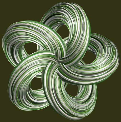 Keywords: mathematica 3d cg parametricplot3d texture torus code program algorithm プログラム コード アルゴリズム 輪環 りんかん ドーナツ どーなつ トーラス とーらす knot 結び目 むすびめ mapping テクスチャ マッピング 模様 もよう design pattern デザイン パターン graphic グラフィック グラフィクス structure 意匠 構造 symmetry 対称性 たいしょうせい シンメトリー 対称 たいしょう drawing indoor abstract black background a = 16; (* center hole size of a torus *) b1 = 5; (* the number of angles *) b2 = 5; (* the number of waves *) b3 = 7; (* the number of knots *) c = 18; (* distance from the center of rotation *) d = 5; (* the number of tori *) h1 = 3; (* width of a torus *) h2 = 5; (* width of a torus *) h3 = 3; (* height of cross *) SetOptions[ParametricPlot3D, PlotRange -> Full, Mesh -> None, Boxed -> False, Axes -> None, PlotPoints -> 500, ImageSize -> 3000, Background -> RGBColor[{50, 50, 20}/255], PlotStyle -> Directive[Specularity[White, 50], Texture[Import["D:/tmp/911.jpg"]]], TextureCoordinateFunction -> ({#4, #5 /Pi} &), Lighting -> "Neutral"]; x = (a - h1 Cos[t] + h2 Sin[b1 s]) Cos[b3 s] + c; y = (a - h1 Cos[t] + h2 Sin[b1 s]) Sin[b3 s] + c; z = h3 Cos[b1 s] + Sin[b2 t] + c; rm = Table[{x, y, z}.RotationMatrix[2 i Pi/d, {1, 0, 1}], {i, d}]; ParametricPlot3D[rm, {t, 0, 2 Pi}, {s, 0, 2 Pi}] (*--- The Texture *) a = 16; (* center hole size of a torus *) b1 = 5; (* the number of angles *) b2 = 5; (* the number of waves *) b3 = 7; (* the number of knots *) c = 18; (* distance from the center of rotation *) d = 5; (* the number of tori *) h1 = 3; (* width of a torus *) h2 = 5; (* width of a torus *) h3 = 3; (* height of cross *) SetOptions[ParametricPlot3D, PlotRange -> Full, Mesh -> None, Boxed -> False, Axes -> None, PlotPoints -> 500, ImageSize -> 3000, Background -> RGBColor[{50, 50, 20}/255], PlotStyle -> Directive[Specularity[White, 50], Texture[Import["D:/tmp/911.jpg"]]], TextureCoordinateFunction -> ({#4, #5 /Pi} &), Lighting -> "Neutral"]; x = (a - h1 Cos[t] + h2 Sin[b1 s]) Cos[b3 s] + c; y = (a - h1 Cos[t] + h2 Sin[b1 s]) Sin[b3 s] + c; z = h3 Cos[b1 s] + Sin[b2 t] + c; rm = Table[{x, y, z}.RotationMatrix[2 i Pi/d, {1, 0, 1}], {i, d}]; ParametricPlot3D[rm, {t, 0, 2 Pi}, {s, 0, 2 Pi}] (*--- The Texture *) |