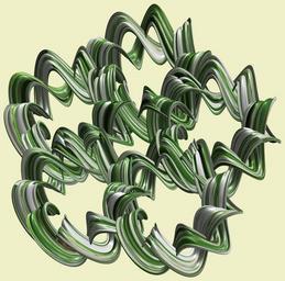Keywords: mathematica 3d cg parametricplot3d texture torus code program algorithm プログラム コード アルゴリズム 輪環 りんかん ドーナツ どーなつ トーラス とーらす knot 結び目 むすびめ mapping テクスチャ マッピング 模様 もよう design pattern デザイン パターン graphic グラフィック グラフィクス structure 意匠 構造 symmetry 対称性 たいしょうせい シンメトリー 対称 たいしょう white background cartoon illustration drawing indoor a = 12; (* center hole size of a torus *) b1 = 9;(* the number of angles *) b2 = 4;(* the number of waves *) b3 = 2; (* the number of knots *) c = 14; (* distance from the center of rotation *) d = 5; (* the number of tori *) h1 = 3; (* width of a torus *) h2 = 2; (* width of a torus *) h3 = 10; (* height of cross *) SetOptions[ParametricPlot3D, PlotRange -> Full, Mesh -> None, Boxed -> False, Axes -> None, PlotPoints -> 500, ImageSize -> 3000, Background -> RGBColor[{240, 240, 200}/255], PlotStyle -> Directive[Specularity[White, 50], Texture[Import["D:/tmp/911.jpg"]]], TextureCoordinateFunction -> ({#4, #5 /Pi} &), Lighting -> "Neutral"]; x = (a - h1 Cos[t] + h2 Sin[b1 s]) Cos[b3 s] + c; y = (a - h1 Cos[t] + h2 Sin[b1 s]) Sin[b3 s] + c; z = h3 Cos[b1 s] + Sin[b2 t] + c; rm = Table[{x, y, z}.RotationMatrix[2 i Pi/d, {0, 0, 1}], {i, d}]; ParametricPlot3D[rm, {t, 0, 2 Pi}, {s, 0, 2 Pi}] (*--- The Texture Another shapes and colors *) a = 12; (* center hole size of a torus *) b1 = 9;(* the number of angles *) b2 = 4;(* the number of waves *) b3 = 2; (* the number of knots *) c = 14; (* distance from the center of rotation *) d = 5; (* the number of tori *) h1 = 3; (* width of a torus *) h2 = 2; (* width of a torus *) h3 = 10; (* height of cross *) SetOptions[ParametricPlot3D, PlotRange -> Full, Mesh -> None, Boxed -> False, Axes -> None, PlotPoints -> 500, ImageSize -> 3000, Background -> RGBColor[{240, 240, 200}/255], PlotStyle -> Directive[Specularity[White, 50], Texture[Import["D:/tmp/911.jpg"]]], TextureCoordinateFunction -> ({#4, #5 /Pi} &), Lighting -> "Neutral"]; x = (a - h1 Cos[t] + h2 Sin[b1 s]) Cos[b3 s] + c; y = (a - h1 Cos[t] + h2 Sin[b1 s]) Sin[b3 s] + c; z = h3 Cos[b1 s] + Sin[b2 t] + c; rm = Table[{x, y, z}.RotationMatrix[2 i Pi/d, {0, 0, 1}], {i, d}]; ParametricPlot3D[rm, {t, 0, 2 Pi}, {s, 0, 2 Pi}] (*--- The Texture Another shapes and colors *) |
