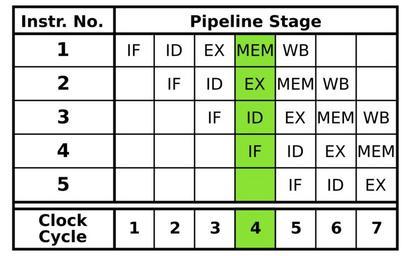 Keywords: 5 Stage Pipeline.svg en A diagram showing the stage of execution reached by five consecutive instructions in a 5-stage microprocessor At clock cycle 4 the 1st instruction is in the memory access phase the second is in the execute phase the third in the instruction decode phase the fourth in the instruction fetch phase and the fifth hasn't been fetched yet own Inductiveload 2009-01-22 Pipeline diagrams computer science SVG flow charts |