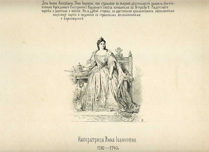 | Keywords: 61 History of the Russian state in the image of its sovereign rulers.jpg ru Импе ат ийца Анна Иоановна 1730-1740 г <br>Дочь Иоанна Алексеевича Анна Иоанновна свое ст емление к полезной деятельности заявила уничтожением уч ежденного Екате иной I Ве ховного Совета основанием в Пете бу ге Кадетского ко пуса и заботами о войске о с д угой сто оны её ца ствование ознаменовалось возвышением иноземной па тии и соединено с ст ашным воспоминанием о Би оновщине full 61 History of the Russian state in the image of its sovereign rulers - fragment jpg Anna of Russia in engraved portraits |