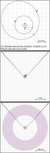 Keywords: 61VirginisSystem.svg en Plot of the orbits of the 61 Virginis system Orbit and debris disk data taken from Vogt et al 2010 The Astrophysical Journal 708 2 1366 “1375 A Super-Earth and Two Neptunes Orbiting the Nearby Sun-like Star 61 Virginis The configuration is given in Table 4 and the orbits are taken to be coplanar Planetary positions are given for the epoch JD 2453369 166 as given in the paper The orbits are taken to be astrocentric rather than barycentric This is because the true masses of the planets are unknown so it is not possible to compute the actual positions of the barycentres own Icalanise 61 Virginis Debris disks |