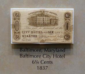 Keywords: 6.25 Cents, Baltimore City Hotel, Baltimore, Maryland, 1837 - National Museum of American History - DSC00201.jpg en Exhibit in the National Museum of American History Washington DC USA Photography was permitted in the museum without restriction 2015-03-27 11 30 05 own Daderot other versions cc-zero Banknotes in the National Museum of American History Local currencies of the United States |