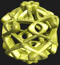 Keywords: mathematica 3d cg parametricplot3d texture torus 輪環 りんかん ドーナツ どーなつ 六芒星 ろくぼうせい 六光星 ろくこうせい 六稜星 ろくりょうせい code program algorithm コード プログラム アルゴリズム hexagram geometric sculpture geometricsculpture shape geometry sculpture mapping テクスチャ マッピング 模様 もよう abstract 抽象 ちゅうしょう アブストラクト design pattern デザイン パターン graphic グラフィック グラフィクス structure 意匠 構造 symmetry 対称性 たいしょうせい シンメトリー 対称 たいしょう algorithm コード black background indoor food a = 8; (* center hole size of a torus *) b = 6; (* hexa-torus *) c = -9; (* distance from the center of rotation *) d = 6; (* number of torus *) h = 3; (* height of a torus *) SetOptions[ParametricPlot3D, PlotRange -> Full, Mesh -> None, Boxed -> False, Axes -> False, PlotPoints -> 400, ImageSize -> 3000, Background -> RGBColor[{30, 30, 30}/255], PlotStyle -> Directive[Specularity[White, 30], Texture[Import["D:/tmp/71.jpg"]]], TextureCoordinateFunction -> ({#4, #5 b Pi} &), Lighting -> "Neutral"]; f[v_] := Sin[2 Sin[Sin[Sin[v]]]]; x = (a - Cos[t] - Sin[b s]) Cos[s + Pi/(2 b)]; y = (a - Cos[t] - Sin[b s]) Sin[s + Pi/(2 b)]; z = (a - f[t] - h Sin[b s]) + c; rm = Table[{x, y, z}.RotationMatrix[2 i Pi/d, {1, 0, 0}], {i, d}]; ParametricPlot3D[rm, {t, 0, 2 Pi}, {s, 0, 2 Pi}] (*--- The Texture *) a = 8; (* center hole size of a torus *) b = 6; (* hexa-torus *) c = -9; (* distance from the center of rotation *) d = 6; (* number of torus *) h = 3; (* height of a torus *) SetOptions[ParametricPlot3D, PlotRange -> Full, Mesh -> None, Boxed -> False, Axes -> False, PlotPoints -> 400, ImageSize -> 3000, Background -> RGBColor[{30, 30, 30}/255], PlotStyle -> Directive[Specularity[White, 30], Texture[Import["D:/tmp/71.jpg"]]], TextureCoordinateFunction -> ({#4, #5 b Pi} &), Lighting -> "Neutral"]; f[v_] := Sin[2 Sin[Sin[Sin[v]]]]; x = (a - Cos[t] - Sin[b s]) Cos[s + Pi/(2 b)]; y = (a - Cos[t] - Sin[b s]) Sin[s + Pi/(2 b)]; z = (a - f[t] - h Sin[b s]) + c; rm = Table[{x, y, z}.RotationMatrix[2 i Pi/d, {1, 0, 0}], {i, d}]; ParametricPlot3D[rm, {t, 0, 2 Pi}, {s, 0, 2 Pi}] (*--- The Texture *) |