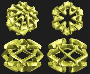 Keywords: mathematica 3d cg parametricplot3d texture torus 輪環 りんかん ドーナツ どーなつ 六芒星 ろくぼうせい 六光星 ろくこうせい 六稜星 ろくりょうせい code program algorithm コード プログラム アルゴリズム hexagram geometric sculpture geometricsculpture shape geometry sculpture mapping テクスチャ マッピング 模様 もよう abstract 抽象 ちゅうしょう アブストラクト design pattern デザイン パターン graphic グラフィック グラフィクス structure 意匠 構造 symmetry 対称性 たいしょうせい シンメトリー 対称 たいしょう algorithm コード indoor black background foliage plant a = 5; (* center hole size of a torus *) b = 6; (* hexa-torus *) c = -10; (* distance from the center of rotation *) d = 6; (* number of torus *) h = 2; (* height of a torus *) SetOptions[ParametricPlot3D, PlotRange -> Full, Mesh -> None, Boxed -> False, Axes -> False, PlotPoints -> 400, ImageSize -> 1600, Background -> RGBColor[{30, 30, 30}/255], PlotStyle -> Directive[Specularity[White, 30], Texture[Import["D:/tmp/71.jpg"]]], TextureCoordinateFunction -> ({#4, #5 b Pi} &), Lighting -> "Neutral"]; f[v_] := Sin[2 Sin[Sin[Sin[v]]]]; x = (a - Cos[t] - Sin[b s]) Cos[s + Pi/(2 b)]; y = (a - Cos[t] - Sin[b s]) Sin[s + Pi/(2 b)]; z = (a - f[t] - h Sin[b s]) + c; rm = Table[{x, y, z}.RotationMatrix[2 i Pi/d, {1, 0, 0}], {i, d}]; ParametricPlot3D[rm, {t, 0, 2 Pi}, {s, 0, 2 Pi}] (*--- The Texture *) a = 5; (* center hole size of a torus *) b = 6; (* hexa-torus *) c = -10; (* distance from the center of rotation *) d = 6; (* number of torus *) h = 2; (* height of a torus *) SetOptions[ParametricPlot3D, PlotRange -> Full, Mesh -> None, Boxed -> False, Axes -> False, PlotPoints -> 400, ImageSize -> 1600, Background -> RGBColor[{30, 30, 30}/255], PlotStyle -> Directive[Specularity[White, 30], Texture[Import["D:/tmp/71.jpg"]]], TextureCoordinateFunction -> ({#4, #5 b Pi} &), Lighting -> "Neutral"]; f[v_] := Sin[2 Sin[Sin[Sin[v]]]]; x = (a - Cos[t] - Sin[b s]) Cos[s + Pi/(2 b)]; y = (a - Cos[t] - Sin[b s]) Sin[s + Pi/(2 b)]; z = (a - f[t] - h Sin[b s]) + c; rm = Table[{x, y, z}.RotationMatrix[2 i Pi/d, {1, 0, 0}], {i, d}]; ParametricPlot3D[rm, {t, 0, 2 Pi}, {s, 0, 2 Pi}] (*--- The Texture *) |