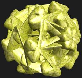 Keywords: mathematica 3d cg parametricplot3d texture torus 輪環 りんかん ドーナツ どーなつ 六芒星 ろくぼうせい 六光星 ろくこうせい 六稜星 ろくりょうせい code program algorithm コード プログラム アルゴリズム hexagram geometric sculpture geometricsculpture shape geometry sculpture mapping テクスチャ マッピング 模様 もよう abstract 抽象 ちゅうしょう アブストラクト design pattern デザイン パターン graphic グラフィック グラフィクス structure 意匠 構造 symmetry 対称性 たいしょうせい シンメトリー 対称 たいしょう algorithm コード black background indoor a = 5; (* center hole size of a torus *) b = 6; (* hexa-torus *) c = -6; (* distance from the center of rotation *) d = 6; (* number of torus *) h = 2; (* height of a torus *) SetOptions[ParametricPlot3D, PlotRange -> Full, Mesh -> None, Boxed -> False, Axes -> False, PlotPoints -> 400, ImageSize -> 1600, Background -> RGBColor[{30, 30, 30}/255], PlotStyle -> Directive[Specularity[White, 30], Texture[Import["D:/tmp/71.jpg"]]], TextureCoordinateFunction -> ({#4, #5 b Pi} &), Lighting -> "Neutral"]; f[v_] := Sin[2 Sin[Sin[Sin[v]]]]; x = (a - Cos[t] - Sin[b s]) Cos[s + Pi/(2 b)]; y = (a - Cos[t] - Sin[b s]) Sin[s + Pi/(2 b)]; z = (a - f[t] - h Sin[b s]) + c; rm = Table[{x, y, z}.RotationMatrix[2 i Pi/d, {1, 0, 0}], {i, d}]; ParametricPlot3D[rm, {t, 0, 2 Pi}, {s, 0, 2 Pi}] (*--- The Texture *) a = 5; (* center hole size of a torus *) b = 6; (* hexa-torus *) c = -6; (* distance from the center of rotation *) d = 6; (* number of torus *) h = 2; (* height of a torus *) SetOptions[ParametricPlot3D, PlotRange -> Full, Mesh -> None, Boxed -> False, Axes -> False, PlotPoints -> 400, ImageSize -> 1600, Background -> RGBColor[{30, 30, 30}/255], PlotStyle -> Directive[Specularity[White, 30], Texture[Import["D:/tmp/71.jpg"]]], TextureCoordinateFunction -> ({#4, #5 b Pi} &), Lighting -> "Neutral"]; f[v_] := Sin[2 Sin[Sin[Sin[v]]]]; x = (a - Cos[t] - Sin[b s]) Cos[s + Pi/(2 b)]; y = (a - Cos[t] - Sin[b s]) Sin[s + Pi/(2 b)]; z = (a - f[t] - h Sin[b s]) + c; rm = Table[{x, y, z}.RotationMatrix[2 i Pi/d, {1, 0, 0}], {i, d}]; ParametricPlot3D[rm, {t, 0, 2 Pi}, {s, 0, 2 Pi}] (*--- The Texture *) |