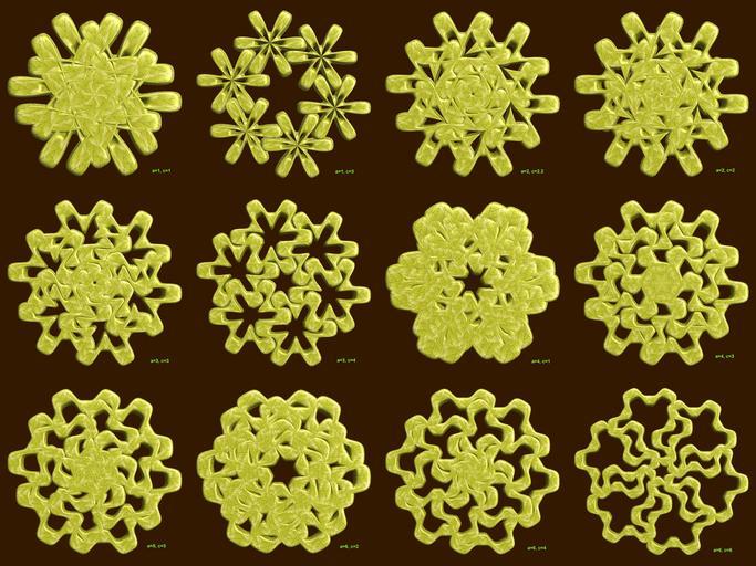 Keywords: mathematica 3d cg parametricplot3d texture torus 輪環 りんかん ドーナツ どーなつ 六芒星 ろくぼうせい 六光星 ろくこうせい 六稜星 ろくりょうせい プログラム コード code program algorithm コード アルゴリズム hexagram geometric sculpture geometricsculpture shape geometry sculpture mapping テクスチャ マッピング 模様 もよう abstract 抽象 ちゅうしょう アブストラクト design pattern デザイン パターン graphic グラフィック グラフィクス structure 意匠 構造 symmetry 対称性 たいしょうせい シンメトリー 対称 たいしょう algorithm plant flower foliage outdoor a = 6; (* center hole size of a torus *) b = 6; (* hexa-torus *) c = 6; (* distance from the center of rotation *) d = 6; (* number of torus *) SetOptions[ParametricPlot3D, PlotRange -> Full, Mesh -> None, Boxed -> False, Axes -> None, PlotPoints -> 400, ImageSize -> 3000, Background -> Darker[Orange, 0.8], PlotStyle -> Directive[Specularity[White, 50], Texture[Import["D:/tmp/71.jpg"]]], TextureCoordinateFunction -> ({#4, #5 b Pi} &), Lighting -> "Neutral"]; f[v_] := Sin[2 Sin[Sin[Sin[v]]]]; x = (a - Cos[t] - f[b s]) Cos[s + Pi/(2 b)] + c; y = f[t] + c; z = (a - Cos[t] - f[b s]) Sin[s + Pi/(2 b)] + c; rot = Table[{x, y, z}.RotationMatrix[2 i Pi/d, {0, 1, 0}], {i, d}]; ParametricPlot3D[rot, {t, 0, 2 Pi}, {s, 0, 2 Pi}] (*--- The Texture *) a = 6; (* center hole size of a torus *) b = 6; (* hexa-torus *) c = 6; (* distance from the center of rotation *) d = 6; (* number of torus *) SetOptions[ParametricPlot3D, PlotRange -> Full, Mesh -> None, Boxed -> False, Axes -> None, PlotPoints -> 400, ImageSize -> 3000, Background -> Darker[Orange, 0.8], PlotStyle -> Directive[Specularity[White, 50], Texture[Import["D:/tmp/71.jpg"]]], TextureCoordinateFunction -> ({#4, #5 b Pi} &), Lighting -> "Neutral"]; f[v_] := Sin[2 Sin[Sin[Sin[v]]]]; x = (a - Cos[t] - f[b s]) Cos[s + Pi/(2 b)] + c; y = f[t] + c; z = (a - Cos[t] - f[b s]) Sin[s + Pi/(2 b)] + c; rot = Table[{x, y, z}.RotationMatrix[2 i Pi/d, {0, 1, 0}], {i, d}]; ParametricPlot3D[rot, {t, 0, 2 Pi}, {s, 0, 2 Pi}] (*--- The Texture *) |
