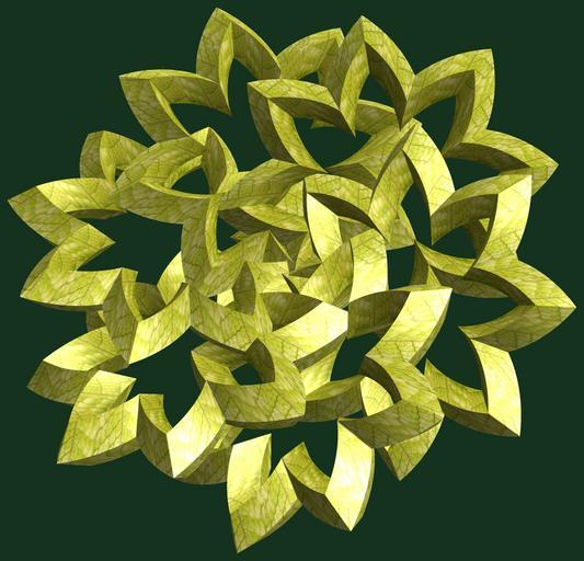 Keywords: mathematica 3d cg parametricplot3d texture torus code program algorithm プログラム コード アルゴリズム 輪環 りんかん ドーナツ どーなつ 八芒星 はちぼうせい geometric sculpture geometricsculpture shape geometry sculpture mapping テクスチャ マッピング 模様 もよう abstract 抽象 ちゅうしょう アブストラクト design pattern デザイン パターン graphic グラフィック グラフィクス structure 意匠 構造 symmetry 対称性 たいしょうせい シンメトリー 対称 たいしょう organic pattern plant foliage tree black background leaf outdoor a = 4; (* center hole size *) b = 8; (* octa-torus *) c = 4; (* distance from the center of rotation *) d = 6; (* number of torus *) h = 0; (* height of a torus *) SetOptions[ParametricPlot3D, PlotRange -> Full, Mesh -> None, Boxed -> False, Axes -> False, PlotPoints -> 400, ImageSize -> 3000, Background -> RGBColor[{20, 50, 30}/255], PlotStyle -> Directive[Specularity[White, 30], Texture[Import["D:/tmp/71.jpg"]]], TextureCoordinateFunction -> ({#4, #5 Pi} &), Lighting -> "Neutral"]; f[v_] := TriangleWave[{-1, 1}, v/(2 Pi)]; g[v_] := TriangleWave[{-1, 1}, v/(2 Pi) + 1/4]; x = (a - g[t] - f[b s]) Cos[s] + c; y = (a - g[t] - f[b s]) Sin[s] + c; z = (a - f[t] - h f[b s]); rm = Table[{x, y, z}.RotationMatrix[2 i Pi/d, {0, 1, 2}], {i, d}]; ParametricPlot3D[rm, {t, 0, 2 Pi}, {s, 0, Pi}] (*--- The Texture *) a = 4; (* center hole size *) b = 8; (* octa-torus *) c = 4; (* distance from the center of rotation *) d = 6; (* number of torus *) h = 0; (* height of a torus *) SetOptions[ParametricPlot3D, PlotRange -> Full, Mesh -> None, Boxed -> False, Axes -> False, PlotPoints -> 400, ImageSize -> 3000, Background -> RGBColor[{20, 50, 30}/255], PlotStyle -> Directive[Specularity[White, 30], Texture[Import["D:/tmp/71.jpg"]]], TextureCoordinateFunction -> ({#4, #5 Pi} &), Lighting -> "Neutral"]; f[v_] := TriangleWave[{-1, 1}, v/(2 Pi)]; g[v_] := TriangleWave[{-1, 1}, v/(2 Pi) + 1/4]; x = (a - g[t] - f[b s]) Cos[s] + c; y = (a - g[t] - f[b s]) Sin[s] + c; z = (a - f[t] - h f[b s]); rm = Table[{x, y, z}.RotationMatrix[2 i Pi/d, {0, 1, 2}], {i, d}]; ParametricPlot3D[rm, {t, 0, 2 Pi}, {s, 0, Pi}] (*--- The Texture *) |