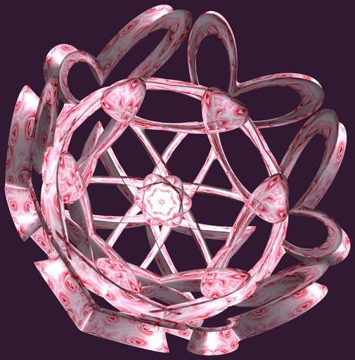 | Keywords: mathematica 3d cg parametricplot3d texture torus 輪環 りんかん ドーナツ どーなつ 五芒星 ごぼうせい 五光星 ごこうせい 五稜星 ごりょうせい code program algorithm コード プログラム アルゴリズム pentagram geometric sculpture geometricsculpture shape geometry sculpture mapping テクスチャ マッピング 模様 もよう abstract 抽象 ちゅうしょう アブストラクト design pattern デザイン パターン graphic グラフィック グラフィクス structure 意匠 構造 symmetry 対称性 たいしょうせい シンメトリー 対称 たいしょう algorithm コード black background tangle wheel surreal a = 2; (* center hole size of a torus *) b = 5; (* penta-torus *) c = 3; (* distance from the center of rotation *) d = 6; (* number of torus *) h = 1; (* height of a torus *) SetOptions[ParametricPlot3D, PlotRange -> Full, Mesh -> None, Boxed -> False, Axes -> False, PlotPoints -> 400, ImageSize -> 3000, Background -> RGBColor[{50, 25, 50}/255], PlotStyle -> Directive[Specularity[White, 30], Texture[Import["D:/tmp/86.jpg"]]], TextureCoordinateFunction -> ({#4, #5 2 Pi} &), Lighting -> "Neutral"]; f[v_] := Cos[2 Cos[Cos[Cos[v]]]]; x = (a - f[t] - Sin[b s]) Cos[s + 3 Pi/(4 b)] + c; y = (a - f[t] - Sin[b s]) Sin[s + 3 Pi/(4 b)] + c; z = (a - Sin[t/2] - h Sin[b s]); rot = Table[{x, y, z}.RotationMatrix[2 i Pi/d, {1, 1, 2}], {i, d}]; ParametricPlot3D[rot, {t, 0, 2 Pi}, {s, 0, 2 Pi}] (*--- The Texture *) a = 2; (* center hole size of a torus *) b = 5; (* penta-torus *) c = 3; (* distance from the center of rotation *) d = 6; (* number of torus *) h = 1; (* height of a torus *) SetOptions[ParametricPlot3D, PlotRange -> Full, Mesh -> None, Boxed -> False, Axes -> False, PlotPoints -> 400, ImageSize -> 3000, Background -> RGBColor[{50, 25, 50}/255], PlotStyle -> Directive[Specularity[White, 30], Texture[Import["D:/tmp/86.jpg"]]], TextureCoordinateFunction -> ({#4, #5 2 Pi} &), Lighting -> "Neutral"]; f[v_] := Cos[2 Cos[Cos[Cos[v]]]]; x = (a - f[t] - Sin[b s]) Cos[s + 3 Pi/(4 b)] + c; y = (a - f[t] - Sin[b s]) Sin[s + 3 Pi/(4 b)] + c; z = (a - Sin[t/2] - h Sin[b s]); rot = Table[{x, y, z}.RotationMatrix[2 i Pi/d, {1, 1, 2}], {i, d}]; ParametricPlot3D[rot, {t, 0, 2 Pi}, {s, 0, 2 Pi}] (*--- The Texture *) |