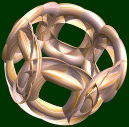 Keywords: mathematica 3d cg parametricplot3d texture torus 輪環 りんかん ドーナツ どーなつ 四芒星 しぼうせい 四光星 しこうせい 四稜星 しりょうせい program プログラム code コード algorithm コード アルゴリズム geometric sculpture geometricsculpture shape geometry sculpture mapping テクスチャ マッピング 模様 もよう design pattern デザイン パターン graphic グラフィック グラフィクス structure 意匠 構造 symmetry 対称性 たいしょうせい シンメトリー 対称 たいしょう algorithm photo border surreal bright SetOptions[ParametricPlot3D, PlotRange -> Full, Mesh -> None, Boxed -> False, Axes -> None, PlotPoints -> 400, ImageSize -> 3000, Background -> Darker[Green, 0.8], PlotStyle -> Directive[Specularity[White, 30], Texture[Import["D:/tmp/861.jpg"]]], TextureCoordinateFunction -> ({#4 + #5, #5/Pi} &), Lighting -> "Neutral"]; a = 4; (* center hole size of a torus *) b = 4; (* tetra-torus *) c = 7; (* distance from the center of rotation *) d = 6; (* number of torus *) v = 3; w = 0.5; x = (a - Cos[w t] - Sin[b s]) Cos[v (s + Pi/(2 b))] + c; y = Sin[w t] Sin[b s] + c; z = (a - Cos[w t] - Sin[b s]) Sin[v (s + Pi/(2 b))] + c; rot = Table[{x, y, z}.RotationMatrix[2 i Pi/d, {1, 0, 1}], {i, d}]; ParametricPlot3D[rot, {t, 0, 2 Pi}, {s, 0, 2 Pi}] (*--- The Texture *) SetOptions[ParametricPlot3D, PlotRange -> Full, Mesh -> None, Boxed -> False, Axes -> None, PlotPoints -> 400, ImageSize -> 3000, Background -> Darker[Green, 0.8], PlotStyle -> Directive[Specularity[White, 30], Texture[Import["D:/tmp/861.jpg"]]], TextureCoordinateFunction -> ({#4 + #5, #5/Pi} &), Lighting -> "Neutral"]; a = 4; (* center hole size of a torus *) b = 4; (* tetra-torus *) c = 7; (* distance from the center of rotation *) d = 6; (* number of torus *) v = 3; w = 0.5; x = (a - Cos[w t] - Sin[b s]) Cos[v (s + Pi/(2 b))] + c; y = Sin[w t] Sin[b s] + c; z = (a - Cos[w t] - Sin[b s]) Sin[v (s + Pi/(2 b))] + c; rot = Table[{x, y, z}.RotationMatrix[2 i Pi/d, {1, 0, 1}], {i, d}]; ParametricPlot3D[rot, {t, 0, 2 Pi}, {s, 0, 2 Pi}] (*--- The Texture *) |