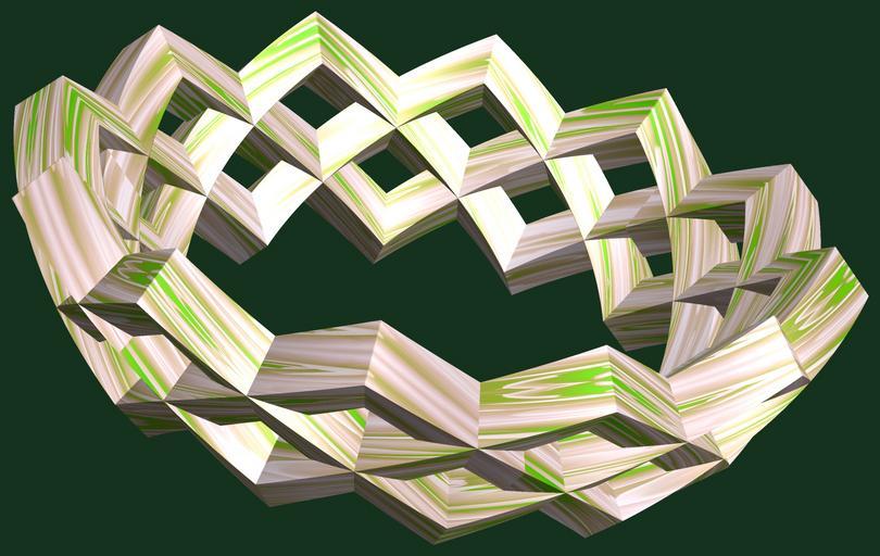 Keywords: mathematica 3d cg parametricplot3d texture torus code program algorithm プログラム コード アルゴリズム 輪環 りんかん ドーナツ どーなつ 四芒星 しぼうせい geometric sculpture geometricsculpture shape geometry sculpture mapping テクスチャ マッピング 模様 もよう abstract 抽象 ちゅうしょう アブストラクト design pattern デザイン パターン graphic グラフィック グラフィクス structure 意匠 構造 symmetry 対称性 たいしょうせい シンメトリー 対称 たいしょう black background photo border a = 8; (* center hole size *) b = 4; (* tetra-torus *) c = 0; (* distance from the center of rotation *) d = 6; (* number of torus *) h = 2; (* height of a torus *) SetOptions[ParametricPlot3D, PlotRange -> Full, Mesh -> None, Boxed -> False, Axes -> False, PlotPoints -> 400, ImageSize -> 3000, Background -> RGBColor[{20, 50, 30}/255], PlotStyle -> Directive[Specularity[White, 70], Texture[Import["D:/tmp/862.jpg"]]], TextureCoordinateFunction -> ({#4 + #5, #5 / Pi} &), Lighting -> "Neutral"]; f[v_] := TriangleWave[{-1, 1}, v/(2 Pi)]; g[v_] := TriangleWave[{-1, 1}, v/(2 Pi) + 1/4]; x = (a - g[t] - f[b s]) Cos[s]; y = (a - g[t] - f[b s]) Sin[s]; z = (a - f[t] - h f[b s]) + c; rm = Table[{x, y, z}.RotationMatrix[2 i Pi/d, {0, 0, 1}], {i, d}]; ParametricPlot3D[rm, {t, 0, 2 Pi}, {s, 0, Pi}] (*--- The Texture *) a = 8; (* center hole size *) b = 4; (* tetra-torus *) c = 0; (* distance from the center of rotation *) d = 6; (* number of torus *) h = 2; (* height of a torus *) SetOptions[ParametricPlot3D, PlotRange -> Full, Mesh -> None, Boxed -> False, Axes -> False, PlotPoints -> 400, ImageSize -> 3000, Background -> RGBColor[{20, 50, 30}/255], PlotStyle -> Directive[Specularity[White, 70], Texture[Import["D:/tmp/862.jpg"]]], TextureCoordinateFunction -> ({#4 + #5, #5 / Pi} &), Lighting -> "Neutral"]; f[v_] := TriangleWave[{-1, 1}, v/(2 Pi)]; g[v_] := TriangleWave[{-1, 1}, v/(2 Pi) + 1/4]; x = (a - g[t] - f[b s]) Cos[s]; y = (a - g[t] - f[b s]) Sin[s]; z = (a - f[t] - h f[b s]) + c; rm = Table[{x, y, z}.RotationMatrix[2 i Pi/d, {0, 0, 1}], {i, d}]; ParametricPlot3D[rm, {t, 0, 2 Pi}, {s, 0, Pi}] (*--- The Texture *) |