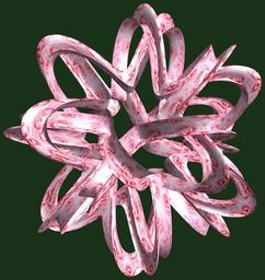 Keywords: mathematica 3d cg parametricplot3d texture torus 輪環 りんかん ドーナツ どーなつ 四芒星 しぼうせい 四光星 しこうせい 四稜星 しりょうせい code program algorithm コード プログラム アルゴリズム geometric sculpture geometricsculpture shape geometry sculpture mapping テクスチャ マッピング 模様 もよう abstract 抽象 ちゅうしょう アブストラクト design pattern デザイン パターン graphic グラフィック グラフィクス structure 意匠 構造 symmetry 対称性 たいしょうせい シンメトリー 対称 たいしょう algorithm コード plant blossom organic pattern black background pastel outdoor foliage flower a = 3; (* center hole size of a torus *) b = 4; (* tetra-torus *) c = 2; (* distance from the center of rotation *) d = 6; (* number of torus *) h = 1; (* height of a torus *) SetOptions[ParametricPlot3D, PlotRange -> Full, Mesh -> None, Boxed -> False, Axes -> False, PlotPoints -> 400, ImageSize -> 3000, Background -> RGBColor[{25, 50, 25}/255], PlotStyle -> Directive[Specularity[White, 30], Texture[Import["D:/tmp/86.jpg"]]], TextureCoordinateFunction -> ({#4, #5 2 Pi} &), Lighting -> "Neutral"]; f[v_] := Cos[2 Cos[Cos[Cos[v]]]]; x = (a - f[t] - Sin[b s]) Cos[s + 3 Pi/(4 b)] + c; y = (a - f[t] - Sin[b s]) Sin[s + 3 Pi/(4 b)] + c; z = (a - Sin[t/2] - h Sin[b s]); rot = Table[{x, y, z}.RotationMatrix[2 i Pi/d, {1, 1, 0}], {i, d}]; ParametricPlot3D[rot, {t, 0, 2 Pi}, {s, 0, 2 Pi}] (*--- The Texture *) a = 3; (* center hole size of a torus *) b = 4; (* tetra-torus *) c = 2; (* distance from the center of rotation *) d = 6; (* number of torus *) h = 1; (* height of a torus *) SetOptions[ParametricPlot3D, PlotRange -> Full, Mesh -> None, Boxed -> False, Axes -> False, PlotPoints -> 400, ImageSize -> 3000, Background -> RGBColor[{25, 50, 25}/255], PlotStyle -> Directive[Specularity[White, 30], Texture[Import["D:/tmp/86.jpg"]]], TextureCoordinateFunction -> ({#4, #5 2 Pi} &), Lighting -> "Neutral"]; f[v_] := Cos[2 Cos[Cos[Cos[v]]]]; x = (a - f[t] - Sin[b s]) Cos[s + 3 Pi/(4 b)] + c; y = (a - f[t] - Sin[b s]) Sin[s + 3 Pi/(4 b)] + c; z = (a - Sin[t/2] - h Sin[b s]); rot = Table[{x, y, z}.RotationMatrix[2 i Pi/d, {1, 1, 0}], {i, d}]; ParametricPlot3D[rot, {t, 0, 2 Pi}, {s, 0, 2 Pi}] (*--- The Texture *) |