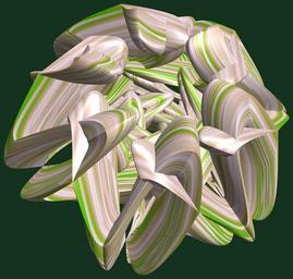 Keywords: mathematica 3d cg parametricplot3d texture torus code program algorithm tri-torus tritorus プログラム コード アルゴリズム 輪環 りんかん ドーナツ どーなつ 四芒星 しぼうせい geometric sculpture geometricsculpture shape geometry sculpture mapping テクスチャ マッピング 模様 もよう abstract 抽象 ちゅうしょう アブストラクト design pattern デザイン パターン graphic グラフィック グラフィクス structure 意匠 構造 symmetry 対称性 たいしょうせい シンメトリー 対称 たいしょう black background photo border pastel surreal a = 2; (* center hole size *) b = 4; (* tetra-torus *) c = 5; (* distance from the center of rotation *) d = 6; (* number of torus *) h = 2; (* height of a torus *) SetOptions[ParametricPlot3D, PlotRange -> Full, Mesh -> None, Boxed -> False, Axes -> False, PlotPoints -> 400, ImageSize -> 3000, Background -> RGBColor[{20, 50, 30}/255], PlotStyle -> Directive[Specularity[White, 70], Texture[Import["D:/tmp/862.jpg"]]], TextureCoordinateFunction -> ({#4 + #5, #5 / Pi} &), Lighting -> "Neutral"]; f[v_] := TriangleWave[{-1, 1}, v/(2 Pi)]; g[v_] := TriangleWave[{-1, 1}, v/(2 Pi) + 1/4]; x = (a - g[t] - f[b s]) g[s] + c; y = (a - g[t] - f[b s]) f[s] + c; z = (a - Sin[t] - h Sin[b s]); rm = Table[{x, y, z}.RotationMatrix[2 i Pi/d, {1, 1, 1}], {i, d}]; ParametricPlot3D[rm, {t, 0, 2 Pi}, {s, 0, 2 Pi}] (*--- The Texture *) a = 2; (* center hole size *) b = 4; (* tetra-torus *) c = 5; (* distance from the center of rotation *) d = 6; (* number of torus *) h = 2; (* height of a torus *) SetOptions[ParametricPlot3D, PlotRange -> Full, Mesh -> None, Boxed -> False, Axes -> False, PlotPoints -> 400, ImageSize -> 3000, Background -> RGBColor[{20, 50, 30}/255], PlotStyle -> Directive[Specularity[White, 70], Texture[Import["D:/tmp/862.jpg"]]], TextureCoordinateFunction -> ({#4 + #5, #5 / Pi} &), Lighting -> "Neutral"]; f[v_] := TriangleWave[{-1, 1}, v/(2 Pi)]; g[v_] := TriangleWave[{-1, 1}, v/(2 Pi) + 1/4]; x = (a - g[t] - f[b s]) g[s] + c; y = (a - g[t] - f[b s]) f[s] + c; z = (a - Sin[t] - h Sin[b s]); rm = Table[{x, y, z}.RotationMatrix[2 i Pi/d, {1, 1, 1}], {i, d}]; ParametricPlot3D[rm, {t, 0, 2 Pi}, {s, 0, 2 Pi}] (*--- The Texture *) |