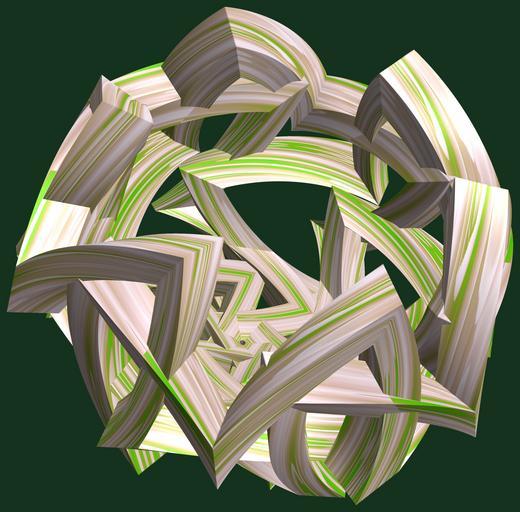 Keywords: mathematica 3d cg parametricplot3d texture torus code program algorithm tri-torus tritorus プログラム コード アルゴリズム 輪環 りんかん ドーナツ どーなつ 四芒星 しぼうせい geometric sculpture geometricsculpture shape geometry sculpture mapping テクスチャ マッピング 模様 もよう abstract 抽象 ちゅうしょう アブストラクト design pattern デザイン パターン graphic グラフィック グラフィクス structure 意匠 構造 symmetry 対称性 たいしょうせい シンメトリー 対称 たいしょう a = 4; (* center hole size *) b = 4; (* tetra-torus *) c = 8; (* distance from the center of rotation *) d = 6; (* number of torus *) h = 2; (* height of a torus *) SetOptions[ParametricPlot3D, PlotRange -> Full, Mesh -> None, Boxed -> False, Axes -> False, PlotPoints -> 400, ImageSize -> 3000, Background -> RGBColor[{20, 50, 30}/255], PlotStyle -> Directive[Specularity[White, 70], Texture[Import["D:/tmp/862.jpg"]]], TextureCoordinateFunction -> ({#4 + #5, #5 / Pi} &), Lighting -> "Neutral"]; f[v_] := TriangleWave[{-1, 1}, v/(2 Pi)]; g[v_] := TriangleWave[{-1, 1}, v/(2 Pi) + 1/4]; x = (a - g[t] - f[b s]) Cos[s] + c; y = (a - g[t] - f[b s]) Sin[s] + c; z = (a - f[t] - h f[b s]); rm = Table[{x, y, z}.RotationMatrix[2 i Pi/d, {1, 1, 1}], {i, d}]; ParametricPlot3D[rm, {t, 0, 2 Pi}, {s, 0, 2 Pi}] (*--- The Texture *) a = 4; (* center hole size *) b = 4; (* tetra-torus *) c = 8; (* distance from the center of rotation *) d = 6; (* number of torus *) h = 2; (* height of a torus *) SetOptions[ParametricPlot3D, PlotRange -> Full, Mesh -> None, Boxed -> False, Axes -> False, PlotPoints -> 400, ImageSize -> 3000, Background -> RGBColor[{20, 50, 30}/255], PlotStyle -> Directive[Specularity[White, 70], Texture[Import["D:/tmp/862.jpg"]]], TextureCoordinateFunction -> ({#4 + #5, #5 / Pi} &), Lighting -> "Neutral"]; f[v_] := TriangleWave[{-1, 1}, v/(2 Pi)]; g[v_] := TriangleWave[{-1, 1}, v/(2 Pi) + 1/4]; x = (a - g[t] - f[b s]) Cos[s] + c; y = (a - g[t] - f[b s]) Sin[s] + c; z = (a - f[t] - h f[b s]); rm = Table[{x, y, z}.RotationMatrix[2 i Pi/d, {1, 1, 1}], {i, d}]; ParametricPlot3D[rm, {t, 0, 2 Pi}, {s, 0, 2 Pi}] (*--- The Texture *) |
