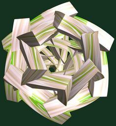 Keywords: mathematica 3d cg parametricplot3d texture torus code program algorithm tri-torus tritorus プログラム コード アルゴリズム 輪環 りんかん ドーナツ どーなつ 四芒星 しぼうせい geometric sculpture geometricsculpture shape geometry sculpture mapping テクスチャ マッピング 模様 もよう abstract 抽象 ちゅうしょう アブストラクト design pattern デザイン パターン graphic グラフィック グラフィクス structure 意匠 構造 symmetry 対称性 たいしょうせい シンメトリー 対称 たいしょう photo border a = 4; (* center hole size *) b = 4; (* tetra-torus *) c = 5; (* distance from the center of rotation *) d = 6; (* number of torus *) h = 2; (* height of a torus *) SetOptions[ParametricPlot3D, PlotRange -> Full, Mesh -> None, Boxed -> False, Axes -> False, PlotPoints -> 400, ImageSize -> 3000, Background -> RGBColor[{20, 50, 30}/255], PlotStyle -> Directive[Specularity[White, 70], Texture[Import["D:/tmp/862.jpg"]]], TextureCoordinateFunction -> ({#4 + #5, #5 / Pi} &), Lighting -> "Neutral"]; f[v_] := TriangleWave[{-1, 1}, v/(2 Pi)]; g[v_] := TriangleWave[{-1, 1}, v/(2 Pi) + 1/4]; x = (a - g[t] - f[b s]) Cos[s] + c; y = (a - g[t] - f[b s]) Sin[s] + c; z = (a - f[t] - h f[b s]); rm = Table[{x, y, z}.RotationMatrix[2 i Pi/d, {1, 1, 1}], {i, d}]; ParametricPlot3D[rm, {t, 0, 2 Pi}, {s, 0, 2 Pi}] (*--- The Texture *) a = 4; (* center hole size *) b = 4; (* tetra-torus *) c = 5; (* distance from the center of rotation *) d = 6; (* number of torus *) h = 2; (* height of a torus *) SetOptions[ParametricPlot3D, PlotRange -> Full, Mesh -> None, Boxed -> False, Axes -> False, PlotPoints -> 400, ImageSize -> 3000, Background -> RGBColor[{20, 50, 30}/255], PlotStyle -> Directive[Specularity[White, 70], Texture[Import["D:/tmp/862.jpg"]]], TextureCoordinateFunction -> ({#4 + #5, #5 / Pi} &), Lighting -> "Neutral"]; f[v_] := TriangleWave[{-1, 1}, v/(2 Pi)]; g[v_] := TriangleWave[{-1, 1}, v/(2 Pi) + 1/4]; x = (a - g[t] - f[b s]) Cos[s] + c; y = (a - g[t] - f[b s]) Sin[s] + c; z = (a - f[t] - h f[b s]); rm = Table[{x, y, z}.RotationMatrix[2 i Pi/d, {1, 1, 1}], {i, d}]; ParametricPlot3D[rm, {t, 0, 2 Pi}, {s, 0, 2 Pi}] (*--- The Texture *) |