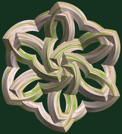 Keywords: mathematica 3d cg parametricplot3d texture torus code program algorithm tri-torus tritorus プログラム コード アルゴリズム 輪環 りんかん ドーナツ どーなつ 三芒星 さんぼうせい geometric sculpture geometricsculpture shape geometry sculpture mapping テクスチャ マッピング 模様 もよう abstract 抽象 ちゅうしょう アブストラクト design pattern デザイン パターン graphic グラフィック グラフィクス structure 意匠 構造 symmetry 対称性 たいしょうせい シンメトリー 対称 たいしょう pastel tangle black background a = 4; (* center hole size *) b = 3; (* tri-torus *) c = 3; (* distance from the center of rotation *) d = 6; (* number of torus *) h = 2; (* height of a torus *) SetOptions[ParametricPlot3D, PlotRange -> Full, Mesh -> None, Boxed -> False, Axes -> False, PlotPoints -> 400, ImageSize -> 3000, Background -> RGBColor[{20, 50, 30}/255], PlotStyle -> Directive[Specularity[White, 40], Texture[Import["D:/tmp/862.jpg"]]], TextureCoordinateFunction -> ({#4 + #5, #5 / Pi} &), Lighting -> "Neutral"]; f[v_] := TriangleWave[{-1, 1}, v/(2 Pi)]; g[v_] := TriangleWave[{-1, 1}, v/(2 Pi) + 1/4]; x = (a - g[t] - f[b s]) Cos[s] + c; y = (a - g[t] - f[b s]) Sin[s] + c; z = (a - f[t] - h f[b s]); rm = Table[{x, y, z}.RotationMatrix[2 i Pi/d, {0, 0, 1}], {i, d}]; ParametricPlot3D[rm, {t, 0, 2 Pi}, {s, 0, Pi}] (*--- The Texture *) a = 4; (* center hole size *) b = 3; (* tri-torus *) c = 3; (* distance from the center of rotation *) d = 6; (* number of torus *) h = 2; (* height of a torus *) SetOptions[ParametricPlot3D, PlotRange -> Full, Mesh -> None, Boxed -> False, Axes -> False, PlotPoints -> 400, ImageSize -> 3000, Background -> RGBColor[{20, 50, 30}/255], PlotStyle -> Directive[Specularity[White, 40], Texture[Import["D:/tmp/862.jpg"]]], TextureCoordinateFunction -> ({#4 + #5, #5 / Pi} &), Lighting -> "Neutral"]; f[v_] := TriangleWave[{-1, 1}, v/(2 Pi)]; g[v_] := TriangleWave[{-1, 1}, v/(2 Pi) + 1/4]; x = (a - g[t] - f[b s]) Cos[s] + c; y = (a - g[t] - f[b s]) Sin[s] + c; z = (a - f[t] - h f[b s]); rm = Table[{x, y, z}.RotationMatrix[2 i Pi/d, {0, 0, 1}], {i, d}]; ParametricPlot3D[rm, {t, 0, 2 Pi}, {s, 0, Pi}] (*--- The Texture *) |