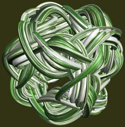 Keywords: mathematica 3d cg parametricplot3d texture torus code program algorithm プログラム コード アルゴリズム 輪環 りんかん ドーナツ どーなつ トーラス とーらす knot 結び目 むすびめ mapping テクスチャ マッピング 模様 もよう design pattern デザイン パターン graphic グラフィック グラフィクス structure 意匠 構造 symmetry 対称性 たいしょうせい シンメトリー 対称 たいしょう indoor a = 12; (* center hole size of a torus *) b1 = 5; (* the number of angles *) b2 = 4; (* the number of waves *) b3 = 2; (* the number of knots *) c = 10; (* distance from the center of rotation *) d = 6; (* the number of tori *) h1 = 3; (* width of a torus *) h2 = 1; (* width of a torus *) h3 = 5; (* height of cross *) SetOptions[ParametricPlot3D, PlotRange -> Full, Mesh -> None, Boxed -> False, Axes -> None, PlotPoints -> 500, ImageSize -> 3000, Background -> RGBColor[{50, 50, 20}/255], PlotStyle -> Directive[Specularity[White, 50], Texture[Import["D:/tmp/91.jpg"]]], TextureCoordinateFunction -> ({#4, #5 /Pi} &), Lighting -> "Neutral"]; x = (a - h1 Cos[t] + h2 Sin[b1 s]) Cos[b3 s]; y = (a - h1 Cos[t] + h2 Sin[b1 s]) Sin[b3 s]; z = h3 Cos[b1 s] + Sin[b2 t] + c; vc = {{0, 0, 1}, {0, 0, -1}, {0, 1, 0}, {0, -1, 0}, {1, 0, 0}, {-1, 0, 0}}; rm = Table[{x, y, z}.RotationMatrix[{{0, 0, 1}, vc[[i]]}], {i, d}]; ParametricPlot3D[rm, {t, 0, 2 Pi}, {s, 0, 2 Pi}] (*--- The Texture *) a = 12; (* center hole size of a torus *) b1 = 5; (* the number of angles *) b2 = 4; (* the number of waves *) b3 = 2; (* the number of knots *) c = 10; (* distance from the center of rotation *) d = 6; (* the number of tori *) h1 = 3; (* width of a torus *) h2 = 1; (* width of a torus *) h3 = 5; (* height of cross *) SetOptions[ParametricPlot3D, PlotRange -> Full, Mesh -> None, Boxed -> False, Axes -> None, PlotPoints -> 500, ImageSize -> 3000, Background -> RGBColor[{50, 50, 20}/255], PlotStyle -> Directive[Specularity[White, 50], Texture[Import["D:/tmp/91.jpg"]]], TextureCoordinateFunction -> ({#4, #5 /Pi} &), Lighting -> "Neutral"]; x = (a - h1 Cos[t] + h2 Sin[b1 s]) Cos[b3 s]; y = (a - h1 Cos[t] + h2 Sin[b1 s]) Sin[b3 s]; z = h3 Cos[b1 s] + Sin[b2 t] + c; vc = {{0, 0, 1}, {0, 0, -1}, {0, 1, 0}, {0, -1, 0}, {1, 0, 0}, {-1, 0, 0}}; rm = Table[{x, y, z}.RotationMatrix[{{0, 0, 1}, vc[[i]]}], {i, d}]; ParametricPlot3D[rm, {t, 0, 2 Pi}, {s, 0, 2 Pi}] (*--- The Texture *) |