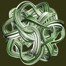 Keywords: mathematica 3d cg parametricplot3d texture torus code program algorithm プログラム コード アルゴリズム 輪環 りんかん ドーナツ どーなつ トーラス とーらす knot 結び目 むすびめ mapping テクスチャ マッピング 模様 もよう design pattern デザイン パターン graphic グラフィック グラフィクス structure 意匠 構造 symmetry 対称性 たいしょうせい シンメトリー 対称 たいしょう indoor drawing tangle a = 12; (* center hole size of a torus *) b1 = 5; (* the number of angles *) b2 = 4; (* the number of waves *) b3 = 2; (* the number of knots *) c = 16; (* distance from the center of rotation *) d = 6; (* the number of tori *) h1 = 3; (* width of a torus *) h2 = 2; (* width of a torus *) h3 = 5; (* height of cross *) SetOptions[ParametricPlot3D, PlotRange -> Full, Mesh -> None, Boxed -> False, Axes -> None, PlotPoints -> 500, ImageSize -> 3000, Background -> RGBColor[{50, 50, 20}/255], PlotStyle -> Directive[Specularity[White, 50], Texture[Import["D:/tmp/911.jpg"]]], TextureCoordinateFunction -> ({#4, #5 /Pi} &), Lighting -> "Neutral"]; x = (a - h1 Cos[t] + h2 Sin[b1 s]) Cos[b3 s]; y = (a - h1 Cos[t] + h2 Sin[b1 s]) Sin[b3 s]; z = h3 Cos[b1 s] + Sin[b2 t] + c; vc = {{0, 0, 1}, {0, 0, -1}, {0, 1, 0}, {0, -1, 0}, {1, 0, 0}, {-1, 0, 0}}; rm = Table[{x, y, z}.RotationMatrix[{{0, 0, 1}, vc[[i]]}], {i, d}]; ParametricPlot3D[rm, {t, 0, 2 Pi}, {s, 0, 2 Pi}] (*--- The Texture *) a = 12; (* center hole size of a torus *) b1 = 5; (* the number of angles *) b2 = 4; (* the number of waves *) b3 = 2; (* the number of knots *) c = 16; (* distance from the center of rotation *) d = 6; (* the number of tori *) h1 = 3; (* width of a torus *) h2 = 2; (* width of a torus *) h3 = 5; (* height of cross *) SetOptions[ParametricPlot3D, PlotRange -> Full, Mesh -> None, Boxed -> False, Axes -> None, PlotPoints -> 500, ImageSize -> 3000, Background -> RGBColor[{50, 50, 20}/255], PlotStyle -> Directive[Specularity[White, 50], Texture[Import["D:/tmp/911.jpg"]]], TextureCoordinateFunction -> ({#4, #5 /Pi} &), Lighting -> "Neutral"]; x = (a - h1 Cos[t] + h2 Sin[b1 s]) Cos[b3 s]; y = (a - h1 Cos[t] + h2 Sin[b1 s]) Sin[b3 s]; z = h3 Cos[b1 s] + Sin[b2 t] + c; vc = {{0, 0, 1}, {0, 0, -1}, {0, 1, 0}, {0, -1, 0}, {1, 0, 0}, {-1, 0, 0}}; rm = Table[{x, y, z}.RotationMatrix[{{0, 0, 1}, vc[[i]]}], {i, d}]; ParametricPlot3D[rm, {t, 0, 2 Pi}, {s, 0, 2 Pi}] (*--- The Texture *) |