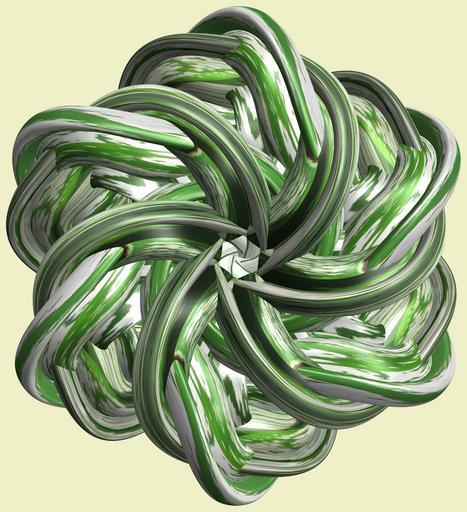 Keywords: mathematica 3d cg parametricplot3d texture torus code program algorithm プログラム コード アルゴリズム 輪環 りんかん ドーナツ どーなつ トーラス とーらす knot 結び目 むすびめ mapping テクスチャ マッピング 模様 もよう design pattern デザイン パターン graphic グラフィック グラフィクス structure 意匠 構造 symmetry 対称性 たいしょうせい シンメトリー 対称 たいしょう white background indoor a = 6; (* center hole size of a torus *) b1 = 5;(* the number of angles *) b2 = 3;(* the number of waves *) b3 = 2; (* the number of knots *) c = 6; (* distance from the center of rotation *) d = 6; (* the number of tori *) h1 = 3; (* width of a torus *) h2 = 1; (* width of a torus *) h3 = 1; (* height of cross *) SetOptions[ParametricPlot3D, PlotRange -> Full, Mesh -> None, Boxed -> False, Axes -> None, PlotPoints -> 500, ImageSize -> 3000, Background -> RGBColor[{240, 240, 200}/255], PlotStyle -> Directive[Specularity[White, 50], Texture[Import["D:/tmp/911.jpg"]]], TextureCoordinateFunction -> ({#4, #5 /Pi} &), Lighting -> "Neutral"]; x = (a - h1 Cos[t] + h2 Sin[b1 s]) Cos[b3 s] + c; y = (a - h1 Cos[t] + h2 Sin[b1 s]) Sin[b3 s] + c; z = h3 Cos[b1 s] + Sin[b2 t] + c; rm = Table[{x, y, z}.RotationMatrix[2 i Pi/d, {1, 0, 1}], {i, d}]; ParametricPlot3D[rm, {t, 0, 2 Pi}, {s, 0, 2 Pi}] (*--- The Texture *) a = 6; (* center hole size of a torus *) b1 = 5;(* the number of angles *) b2 = 3;(* the number of waves *) b3 = 2; (* the number of knots *) c = 6; (* distance from the center of rotation *) d = 6; (* the number of tori *) h1 = 3; (* width of a torus *) h2 = 1; (* width of a torus *) h3 = 1; (* height of cross *) SetOptions[ParametricPlot3D, PlotRange -> Full, Mesh -> None, Boxed -> False, Axes -> None, PlotPoints -> 500, ImageSize -> 3000, Background -> RGBColor[{240, 240, 200}/255], PlotStyle -> Directive[Specularity[White, 50], Texture[Import["D:/tmp/911.jpg"]]], TextureCoordinateFunction -> ({#4, #5 /Pi} &), Lighting -> "Neutral"]; x = (a - h1 Cos[t] + h2 Sin[b1 s]) Cos[b3 s] + c; y = (a - h1 Cos[t] + h2 Sin[b1 s]) Sin[b3 s] + c; z = h3 Cos[b1 s] + Sin[b2 t] + c; rm = Table[{x, y, z}.RotationMatrix[2 i Pi/d, {1, 0, 1}], {i, d}]; ParametricPlot3D[rm, {t, 0, 2 Pi}, {s, 0, 2 Pi}] (*--- The Texture *) |
