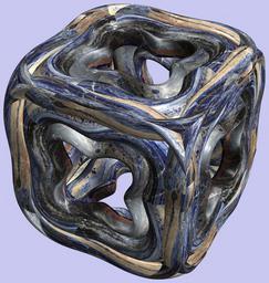 Keywords: mathematica 3d cg parametricplot3d texture torus code program algorithm プログラム コード アルゴリズム 輪環 りんかん ドーナツ どーなつ トーラス とーらす mapping テクスチャ マッピング 模様 もよう abstract 抽象 ちゅうしょう アブストラクト design pattern デザイン パターン graphic グラフィック グラフィクス structure 意匠 構造 symmetry 対称性 たいしょうせい シンメトリー 対称 たいしょう surreal drawing painting white background animal photo border ancient a = 7; (* center hole size of a torus *) b1 = 4;(* the number of angles *) b2 = 3;(* the number of waves *) c = 8; (* distance from the center of rotation *) d = 6; (* the number of tori *) h1 = 3; (* width of a torus *) h2 = 1; (* width of a torus *) SetOptions[ParametricPlot3D, PlotRange -> Full, Mesh -> None, Boxed -> False, Axes -> None, PlotPoints -> 500, ImageSize -> 3000, Background -> RGBColor[{200, 200, 240}/255], PlotStyle -> Directive[Specularity[White, 70], Texture[Import["D:/tmp/94.jpg"]]], TextureCoordinateFunction -> ({#4, #5 Pi} &), Lighting -> "Neutral"]; x = (a - h1 Cos[t] + h2 Sin[b1 s]) Cos[s + Pi/(2 b1)]; y = (a - h1 Cos[t] + h2 Sin[b1 s]) Sin[s + Pi/(2 b1)]; z = Sin[b2 t] + c; vc = {{0, 0, 1}, {0, 0, -1}, {0, 1, 0}, {0, -1, 0}, {1, 0, 0}, {-1, 0, 0}}; rm = Table[{x, y, z}.RotationMatrix[{{0, 0, 1}, vc[[i]]}], {i, d}]; ParametricPlot3D[rm, {t, 0, 2 Pi}, {s, 0, 2 Pi}] (*--- The Texture *) a = 7; (* center hole size of a torus *) b1 = 4;(* the number of angles *) b2 = 3;(* the number of waves *) c = 8; (* distance from the center of rotation *) d = 6; (* the number of tori *) h1 = 3; (* width of a torus *) h2 = 1; (* width of a torus *) SetOptions[ParametricPlot3D, PlotRange -> Full, Mesh -> None, Boxed -> False, Axes -> None, PlotPoints -> 500, ImageSize -> 3000, Background -> RGBColor[{200, 200, 240}/255], PlotStyle -> Directive[Specularity[White, 70], Texture[Import["D:/tmp/94.jpg"]]], TextureCoordinateFunction -> ({#4, #5 Pi} &), Lighting -> "Neutral"]; x = (a - h1 Cos[t] + h2 Sin[b1 s]) Cos[s + Pi/(2 b1)]; y = (a - h1 Cos[t] + h2 Sin[b1 s]) Sin[s + Pi/(2 b1)]; z = Sin[b2 t] + c; vc = {{0, 0, 1}, {0, 0, -1}, {0, 1, 0}, {0, -1, 0}, {1, 0, 0}, {-1, 0, 0}}; rm = Table[{x, y, z}.RotationMatrix[{{0, 0, 1}, vc[[i]]}], {i, d}]; ParametricPlot3D[rm, {t, 0, 2 Pi}, {s, 0, 2 Pi}] (*--- The Texture *) |