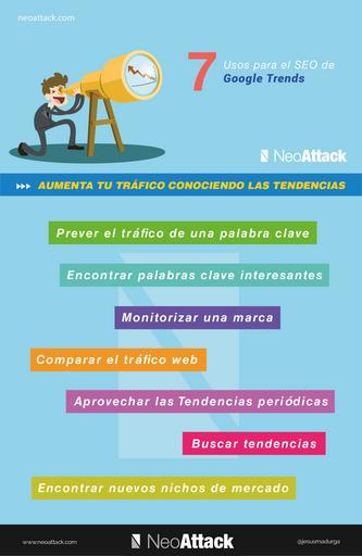 Keywords: google trends tendencias contenidos tematicas sem buscadores marketing online digital herramientas gratis outdoor Google Trends en Español Para ver el artículo entero neoattack.com/google-trends-en-espanol-guia-con-funciones... Guía con Funciones, usos SEO + Video tutorial Google Trends en Español es la herramienta de Google que te ayudará a conocer las tendencias de búsqueda en todo el mundo. Esta herramienta, tanto para los profesionales del SEO como para cualquier profesional del marketing online es indispensable para estar al día y un perfecto complemento para diseñar tu estrategia online. Por ejemplo: Con Google trends un Social Media Manager podrá saber qué temas son los más hablados para postear sobre ello y conseguir un mayor engagement. Con Google Trends un SEO sabrá la tendencia de las palabras clave que ha planificado en su estrategia y podrá tomar decisiones en consecuencia. Con Google Trends un blogger o una empresa podrán ser los primeros en posicionarse por una palabra clave con tendencia alcista y aprovechar las olas de crecimiento de estas para dirigir tráfico web sin mucho esfuerzo. Con Google Trends tu empresa sabrá si en una determinada zona geográfica están interesados por una palabra clave en concreto para determinar si invertir en expandirse a dicha zona o no. Con Google Trends una marca puede ver su propia tendencia y rectificar su estrategia en caso de descenso de la tendencia o ayudarse de los picos para crecer aún más. etc. Pero antes de empezar con los usos para SEO veremos el dashboard con las funciones básicas de Google Trends. Funciones básicas de Google Trends Para ver las funciones básicas vamos a ver parte por parte lo que nos ofrece esta herramienta. Comparar términos Comparar 2 o más términos Compara 2 o más términos individualmente o en grupos utilizando “+”. Se pueden comprar hasta 5 términos individuales o grupos de un máximo de 25 términos en cada grupo. Google Trends nos permite también comprar los términos por ubicaciones. Para ello simplemente tenemos que hacer clic en “Ubicaciones”. Tan y como aparece en la imagen de abajo. Al igual que los términos, podemos añadir también hasta un máximo de 5 ubicaciones, incluidos países y ciudades. Es importante recordar que si no es una búsqueda de una palabra que se utilice en todos los países que añadamos, como en este caso SEO, que vale tanto para inglés como para Español, deberemos hacer las comparaciones de manera independiente. comparar terminos ubicaciones Cómo comparar períodos de tiempo Con Trends también podemos hacer comparaciones de términos en diferentes periodos de tiempo. Para comprar estos términos por intervalos solo tenemos que hacer clic en “intervalos de tiempo”. Al igual que los términos y las ubicaciones, en los intervalos también podemos incluir únicamente 5 periodos de tiempo distintos y modificar la situación geográfica de la búsqueda. comparar termino tiempo Cómo filtrar las búsquedas filtrado busquedas trends Otra de las funciones básicas que nos ofrece Google Trends es la del filtrado de las búsquedas. En este apartado podemos encontrar: Localización geográfica: Las búsquedas que realicemos podemos filtrarlas por países o, en caso de España, comunidades autónomas. Si necesitas conocer tendencias en las búsquedas locales este apartado te resultará de mucha ayuda. Fechas: Filtrado de búsquedas de tendencias por fechas predefinidas o tus propias fechas personalizadas. Categorías: Filtrado por la categoría a la que pertenezca el término de la búsqueda. Lugar de búsqueda: Este filtro te permitirá elegir si quieres buscar en la web, entre las imágenes, noticias, Google Shopping o en Youtube. Cómo exportar datos de búsqueda exportar csv trends La herramienta nos permite que podamos exportar los datos de las búsquedas que hayamos obtenido a un fichero .csv, para que luego lo podamos abrir fácilmente con la aplicación Excell. ¿Cómo lo hacemos? Hacemos clic en los 3 puntos y desplegamos el menú que aparece en la anterior imagen, luego hacemos clic en “Descargar como archivo CSV”, y acto seguido se descargará el archivo en nuestro ordenador. Tendencias en Búsquedas tendencias busquedas google En el menú de Google Trends en Español podemos encontrar, justo después de Explorar, las tendencias en búsquedas. En este apartado encontraremos las tendencias de búsqueda más importantes del año presentadas por días y segmentadas por el país que hayas elegido en caso de que lo hayas hecho. Tendencias en Youtube tendencias busquedas youtube Igual que las tendencias en Búsquedas pero esta vez del buscador de Youtube. Muy útil para ver los vídeos más virales por país y por día. Más populares Una forma de encontrar las búsquedas más populares divididas por categorías y país durante todo el año anterior. El único inconveniente de este apartado es que solo presentan los resultados a año cerrado, pero aún así nos puede ser de utilidad (sobre todo a principio de año) para analizar el año anterior y poder utilizarlo en nuestra estrategia de contenidos. Las categorías de tendencias que ofrecen son: Palabras de mayor crecimiento en el año anterior Futbolistas más buscados Tendencias en Celebrities Destinos más buscados Tendencias en Dietas Tendencias ¿Cómo…? Tendencias ¿Qué es…? busquedas populares googleImagen: Búsquedas más populares en Google Si te parece interesante Google Trends te recomiendo que también te leas nuestro post “Google My Business, SEO para Negocio Local” 7 Usos de Google Trends para el SEO El uso más importante de Google Trends es ayudarnos a conocer cómo evoluciona una keyword a lo largo del tiempo. Sabiendo esto podrás: Prever el tráfico de una palabra clave La más básica de las funciones pero no la menos importante, es usar Google Trends para prever el tráfico de una palabra clave determinada. Si sabemos la tendencia de tráfico 
