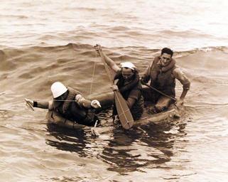 | Keywords: outdoor 80-CF-827-3-11: Life-Saving Equipment. Emergency Fishing Kit, April 19, 1943. No longer do castaways on a life raft need to fear starvation and thirst. A simple, compact, complete, and fool-proof Emergency Fishing Kit is now standard equipment on all lifeboats, rafts, and planes of Navy, Army, and Merchant Marine. Hooks, lines, lures, spear, bait, and a net provide the means to catch food. In addition, the flesh of fish can be squeezed to provide drinking fluid. The kit was originated by Gifford Pinchot and developed by Michael Lerner, S. Kip Farrington, and Philip Wylie. Shown: A large fish is caught on a castaway hook, (left), and the center man in the boat, seeing it to be large, prepares to spear it with the oar blade fitted with a spear end from the kit. U.S. Navy Photograph, now in the collections of the National Archives. (2016/05/03). 80-CF-827-3-11: Life-Saving Equipment. Emergency Fishing Kit, April 19, 1943. No longer do castaways on a life raft need to fear starvation and thirst. A simple, compact, complete, and fool-proof Emergency Fishing Kit is now standard equipment on all lifeboats, rafts, and planes of Navy, Army, and Merchant Marine. Hooks, lines, lures, spear, bait, and a net provide the means to catch food. In addition, the flesh of fish can be squeezed to provide drinking fluid. The kit was originated by Gifford Pinchot and developed by Michael Lerner, S. Kip Farrington, and Philip Wylie. Shown: A large fish is caught on a castaway hook, (left), and the center man in the boat, seeing it to be large, prepares to spear it with the oar blade fitted with a spear end from the kit. U.S. Navy Photograph, now in the collections of the National Archives. (2016/05/03). |