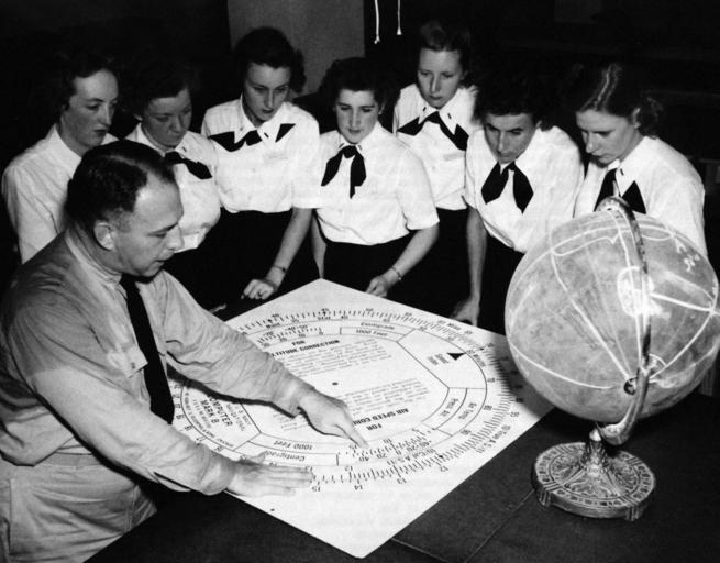 Keywords: blackandwhite monochrome indoor black and white 80-CF-8811-11_Box 175: WAVES Study Aerial Navigation. Nine members of the U.S. Navy Women’s Reserve become pathfinders for others as they take up the study of aerial navigation at the Naval Air Navigation School in Hollywood Beach, Miami, Florida. The girls will take the same intensive course as the “mere males” in the school and on conclusion of the training period be assigned to the duty of teaching others the mysteries of the rapidly developing science. Shown: Mysteries Explained. Lieutenant L.C. Read brings out the Air Computer, a stream-lined form of slide rule, to get the future aerial navigators started on an understanding of their courses. Listening are (left to right) Ensigns Virginia Wishington; Laura Walker; Madeline Burke; Helen Feleki; Kathlene Krebs; Elizabeth Whitten; and Martha Barnes. Photograph released by Seventh Naval District, August 1943. U.S. Navy photograph, now in the collections of the National Archives (2015/11/24). 80-CF-8811-11_Box 175: WAVES Study Aerial Navigation. Nine members of the U.S. Navy Women’s Reserve become pathfinders for others as they take up the study of aerial navigation at the Naval Air Navigation School in Hollywood Beach, Miami, Florida. The girls will take the same intensive course as the “mere males” in the school and on conclusion of the training period be assigned to the duty of teaching others the mysteries of the rapidly developing science. Shown: Mysteries Explained. Lieutenant L.C. Read brings out the Air Computer, a stream-lined form of slide rule, to get the future aerial navigators started on an understanding of their courses. Listening are (left to right) Ensigns Virginia Wishington; Laura Walker; Madeline Burke; Helen Feleki; Kathlene Krebs; Elizabeth Whitten; and Martha Barnes. Photograph released by Seventh Naval District, August 1943. U.S. Navy photograph, now in the collections of the National Archives (2015/11/24). |