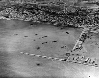 Keywords: 80-G-1003967: North African Invasion, November 1942 Casablanca harbor, Morocco, and vicinity on 16 November 1942, eight days after the 8 November invasion and naval battle there. Among the ships outside the harbor entrance are three U.S. Navy destroyers, a minesweeper and (in center) the torpedoed USS Electra (AK-21) with USS Cherokee (AT-66) off her bow. Closer to shore are three beached French warships (from right to left): light cruiser Primauguet, destroyer Albatros and destroyer Milan. Inside the harbor, with sterns toward the outer breakwater, are eight U.S. Navy ships. They are (from left to right): two minesweepers, USS Terror (CM-4), USS Brooklyn (CL-40), USS Chenango (ACV-28) with a destroyer tied to her starboard side, USS Augusta CA-31) and a transport. Official U.S. Navy Photograph, now in the collections of the National Archives. 80-G-1003967: North African Invasion, November 1942 Casablanca harbor, Morocco, and vicinity on 16 November 1942, eight days after the 8 November invasion and naval battle there. Among the ships outside the harbor entrance are three U.S. Navy destroyers, a minesweeper and (in center) the torpedoed USS Electra (AK-21) with USS Cherokee (AT-66) off her bow. Closer to shore are three beached French warships (from right to left): light cruiser Primauguet, destroyer Albatros and destroyer Milan. Inside the harbor, with sterns toward the outer breakwater, are eight U.S. Navy ships. They are (from left to right): two minesweepers, USS Terror (CM-4), USS Brooklyn (CL-40), USS Chenango (ACV-28) with a destroyer tied to her starboard side, USS Augusta CA-31) and a transport. Official U.S. Navy Photograph, now in the collections of the National Archives. |