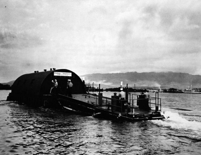 | Keywords: blackandwhite monochrome outdoor vehicle boat sea black and white 80-G-186356: Clothing and small stores barge operating in Pearl Harbor, Territory of Hawaii, consisting of a Quonset Hut secured to a flat harbor barge; sold in a single day as much as $7,000 worth of shoes, socks, shirts, dungaree trousers, and other items in the Navy’s men wardrobe. U.S. Navy photograph, now in the collections of the National Archives. (2015/12/22) 80-G-186356: Clothing and small stores barge operating in Pearl Harbor, Territory of Hawaii, consisting of a Quonset Hut secured to a flat harbor barge; sold in a single day as much as $7,000 worth of shoes, socks, shirts, dungaree trousers, and other items in the Navy’s men wardrobe. U.S. Navy photograph, now in the collections of the National Archives. (2015/12/22) |