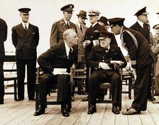 Keywords: 80-G-26876: Atlantic Charter, August 1941. Informal group photograph including President Franklin D. Roosevelt and Prime Minister Winston S. Churchill on deck of HMS Prince of Wales during church services during the Atlantic Charter. Seated with Prime Minister Winston S. Churchill on the deck of the battleship is President Roosevelt who is leaning towards a Royal Navy aide for a brief conversation. Behind the President is General George S. Marshall, U.S. Army Chief of Staff, behind Churchill; Admiral Harold R. Stark, Commander of U.S. Naval Operations in European waters. Photograph released August 1941. U.S. Navy Photograph, now in the collections of the National Archives. (2016/03/22). 80-G-26876: Atlantic Charter, August 1941. Informal group photograph including President Franklin D. Roosevelt and Prime Minister Winston S. Churchill on deck of HMS Prince of Wales during church services during the Atlantic Charter. Seated with Prime Minister Winston S. Churchill on the deck of the battleship is President Roosevelt who is leaning towards a Royal Navy aide for a brief conversation. Behind the President is General George S. Marshall, U.S. Army Chief of Staff, behind Churchill; Admiral Harold R. Stark, Commander of U.S. Naval Operations in European waters. Photograph released August 1941. U.S. Navy Photograph, now in the collections of the National Archives. (2016/03/22). |