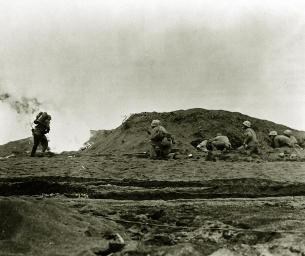 | Keywords: monochrome outdoor 80-G-304845: Battle for Iwo Jima, February-March 1945. A wave of Fourth Division Marines beginning an attack from the beach at Iwo Jima. A die-hard Japanese soldier gets a blast of liquid flame. Fifth Marine Division rifleman surround the dug-out ready to pour covering fire into the opening. The flame thrower, supported by covering rifle fire, has been a basic weapon in the cave to cave-battle on the volcanic rock. Photograph released February 19, 1945. U.S. Navy Photograph now in the collections of the National Archives. (2016/01/19). 80-G-304845: Battle for Iwo Jima, February-March 1945. A wave of Fourth Division Marines beginning an attack from the beach at Iwo Jima. A die-hard Japanese soldier gets a blast of liquid flame. Fifth Marine Division rifleman surround the dug-out ready to pour covering fire into the opening. The flame thrower, supported by covering rifle fire, has been a basic weapon in the cave to cave-battle on the volcanic rock. Photograph released February 19, 1945. U.S. Navy Photograph now in the collections of the National Archives. (2016/01/19). |