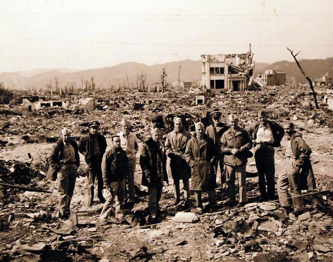 | Keywords: outdoor people ruins architecture 80-G-354619: Atomic Bomb Damage to Hiroshima, as seen by USS Appalachian (AGC-1). Officers of USS Appalachian (AGC-1) at bomb damaged Hiroshima. Photographed by PhoM3/C George Almarez. Photographed received October 26, 1945. U.S. Navy photograph, now in the collections of the National Archives. (2016/06/21). 80-G-354619: Atomic Bomb Damage to Hiroshima, as seen by USS Appalachian (AGC-1). Officers of USS Appalachian (AGC-1) at bomb damaged Hiroshima. Photographed by PhoM3/C George Almarez. Photographed received October 26, 1945. U.S. Navy photograph, now in the collections of the National Archives. (2016/06/21). |