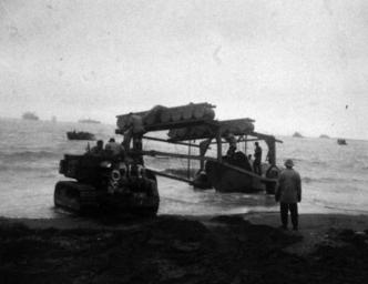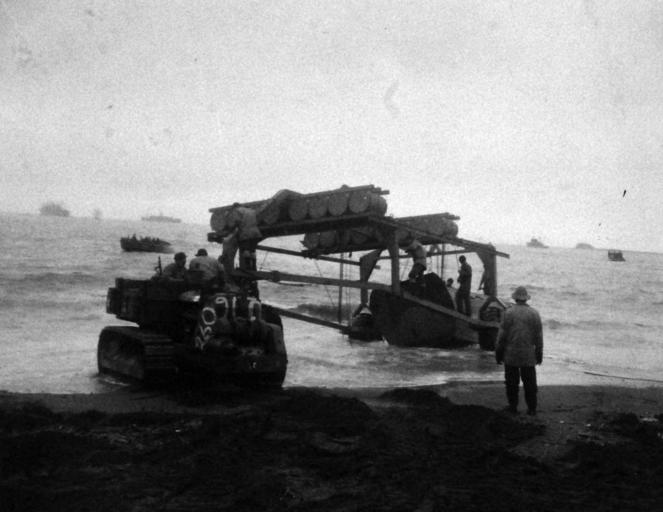 Keywords: blackandwhite monochrome outdoor black and white 80-G-54852: Geeheebee “What-You-Call-It” Serves the Joint Forces. Variously called “geeheebee,” “Jahemy,” “le Tourneau” and “jeramy”, the ungainly structure shown in this series of pictures made by Navy photographers on Attu Island in the Aleutians, does a mighty job of moving and lifting for both the Army and Navy. The Army Engineers use it widely in construction work, such as earth clearing for air fields, swamps and cantonments. The Navy puts oil drums on top to float it to shore, then employs the gadget to lift boats and barges, making a movable drydock. It takes little aboard transporting vessels, being stored on deck so that space beneath it may still be utilized. Tractor hauls up to boat mover and its load. The geeheebee bearing a landing craft comes ashore under the pull-power of a tractor. There, lifted clear of the beach, by the cumbersome equipment, the boat can be repaired, May 11, 1943. Official U.S. Navy photograph, now in the collections of the National Archives. (2016/12/06). 80-G-54852: Geeheebee “What-You-Call-It” Serves the Joint Forces. Variously called “geeheebee,” “Jahemy,” “le Tourneau” and “jeramy”, the ungainly structure shown in this series of pictures made by Navy photographers on Attu Island in the Aleutians, does a mighty job of moving and lifting for both the Army and Navy. The Army Engineers use it widely in construction work, such as earth clearing for air fields, swamps and cantonments. The Navy puts oil drums on top to float it to shore, then employs the gadget to lift boats and barges, making a movable drydock. It takes little aboard transporting vessels, being stored on deck so that space beneath it may still be utilized. Tractor hauls up to boat mover and its load. The geeheebee bearing a landing craft comes ashore under the pull-power of a tractor. There, lifted clear of the beach, by the cumbersome equipment, the boat can be repaired, May 11, 1943. Official U.S. Navy photograph, now in the collections of the National Archives. (2016/12/06). |