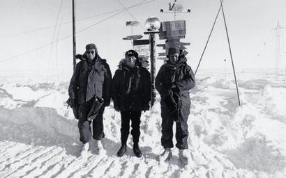 Keywords: monochrome outdoor 80-G-K-87605: Rear Admiral David F. Welch, (center), Commander, U.S. Naval Support Force, Antarctica, and two companions stand beside the post marking the Geographical South Bole, at Amundsen-Scott, South-Pole Station, Antarctica. Photographed by PH1 William J. Galligan, October 31, 1970. NHHC Photographic Section. Black and White photograph only. (2015/10/30) 80-G-K-87605: Rear Admiral David F. Welch, (center), Commander, U.S. Naval Support Force, Antarctica, and two companions stand beside the post marking the Geographical South Bole, at Amundsen-Scott, South-Pole Station, Antarctica. Photographed by PH1 William J. Galligan, October 31, 1970. NHHC Photographic Section. Black and White photograph only. (2015/10/30) |