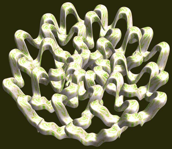 Keywords: mathematica 3d cg parametricplot3d texture torus 輪環 りんかん ドーナツ どーなつ 六芒星 ろくぼうせい 六光星 ろくこうせい 六稜星 ろくりょうせい code program algorithm コード プログラム アルゴリズム hexagram geometric sculpture geometricsculpture shape geometry sculpture mapping テクスチャ マッピング 模様 もよう abstract 抽象 ちゅうしょう アブストラクト design pattern デザイン パターン graphic グラフィック グラフィクス structure 意匠 構造 symmetry 対称性 たいしょうせい シンメトリー 対称 たいしょう algorithm コード organic pattern black background blossom plant a = 6; (* center hole size of a torus *) b = 6; (* hexa-torus *) c = 6; (* distance from the center of rotation *) d = 8; (* number of torus *) h = 2; (* height of a torus *) SetOptions[ParametricPlot3D, PlotRange -> Full, Mesh -> None, Boxed -> False, Axes -> False, PlotPoints -> 400, ImageSize -> 3000, Background -> RGBColor[{40, 40, 10}/255], PlotStyle -> Directive[Specularity[White, 30], Texture[Import["D:/tmp/864.jpg"]]], TextureCoordinateFunction -> ({#4, #5 2 Pi} &), Lighting -> "Neutral"]; f[v_] := Sin[2 Sin[Sin[Sin[v]]]]; x = (a - Cos[t] - Sin[b s]) Cos[s + Pi/(2 b)] + c; y = (a - Cos[t] - Sin[b s]) Sin[s + Pi/(2 b)] + c; z = (f[t] - h f[b s]) + c; rot = Table[{x, y, z}.RotationMatrix[2 i Pi/d, {0, 0, 1}], {i, d}]; ParametricPlot3D[rot, {t, 0, 2 Pi}, {s, 0, 2 Pi}] (*--- The Texture *) a = 6; (* center hole size of a torus *) b = 6; (* hexa-torus *) c = 6; (* distance from the center of rotation *) d = 8; (* number of torus *) h = 2; (* height of a torus *) SetOptions[ParametricPlot3D, PlotRange -> Full, Mesh -> None, Boxed -> False, Axes -> False, PlotPoints -> 400, ImageSize -> 3000, Background -> RGBColor[{40, 40, 10}/255], PlotStyle -> Directive[Specularity[White, 30], Texture[Import["D:/tmp/864.jpg"]]], TextureCoordinateFunction -> ({#4, #5 2 Pi} &), Lighting -> "Neutral"]; f[v_] := Sin[2 Sin[Sin[Sin[v]]]]; x = (a - Cos[t] - Sin[b s]) Cos[s + Pi/(2 b)] + c; y = (a - Cos[t] - Sin[b s]) Sin[s + Pi/(2 b)] + c; z = (f[t] - h f[b s]) + c; rot = Table[{x, y, z}.RotationMatrix[2 i Pi/d, {0, 0, 1}], {i, d}]; ParametricPlot3D[rot, {t, 0, 2 Pi}, {s, 0, 2 Pi}] (*--- The Texture *) |