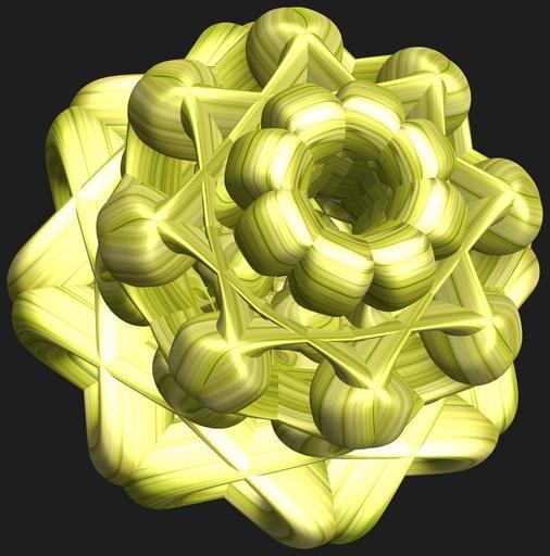 Keywords: mathematica 3d cg parametricplot3d texture torus 輪環 りんかん ドーナツ どーなつ 八芒星 はちぼうせい 八光星 はちこうせい 八稜星 はちりょうせい code program algorithm コード プログラム アルゴリズム geometric sculpture geometricsculpture shape geometry sculpture mapping テクスチャ マッピング 模様 もよう abstract 抽象 ちゅうしょう アブストラクト design pattern デザイン パターン graphic グラフィック グラフィクス structure 意匠 構造 symmetry 対称性 たいしょうせい シンメトリー 対称 たいしょう algorithm コード black background indoor photo border a = 5; (* center hole size of a torus *) b = 8; (* octa-torus *) c = -5; (* distance from the center of rotation *) d = 8; (* number of torus *) h = 2; (* height of a torus *) SetOptions[ParametricPlot3D, PlotRange -> Full, Mesh -> None, Boxed -> False, Axes -> False, PlotPoints -> 400, ImageSize -> 3000, Background -> RGBColor[{30, 30, 30}/255], PlotStyle -> Directive[Specularity[White, 30], Texture[Import["D:/tmp/71.jpg"]]], TextureCoordinateFunction -> ({#4 + #5, #5/Pi} &), Lighting -> "Neutral"]; f[v_] := Sin[2 Sin[Sin[Sin[v]]]]; x = (a - Cos[t] - f[b s]) Cos[s + Pi/(2 b)]; y = (a - Cos[t] - f[b s]) Sin[s + Pi/(2 b)]; z = (a - Sin[t] - h f[b s]) + c; rm = Table[{x, y, z}.RotationMatrix[2 i Pi/d, {1, 0, 0}], {i, d}]; ParametricPlot3D[rm, {t, 0, 2 Pi}, {s, 0, 2 Pi}] (*--- The Texture *) a = 5; (* center hole size of a torus *) b = 8; (* octa-torus *) c = -5; (* distance from the center of rotation *) d = 8; (* number of torus *) h = 2; (* height of a torus *) SetOptions[ParametricPlot3D, PlotRange -> Full, Mesh -> None, Boxed -> False, Axes -> False, PlotPoints -> 400, ImageSize -> 3000, Background -> RGBColor[{30, 30, 30}/255], PlotStyle -> Directive[Specularity[White, 30], Texture[Import["D:/tmp/71.jpg"]]], TextureCoordinateFunction -> ({#4 + #5, #5/Pi} &), Lighting -> "Neutral"]; f[v_] := Sin[2 Sin[Sin[Sin[v]]]]; x = (a - Cos[t] - f[b s]) Cos[s + Pi/(2 b)]; y = (a - Cos[t] - f[b s]) Sin[s + Pi/(2 b)]; z = (a - Sin[t] - h f[b s]) + c; rm = Table[{x, y, z}.RotationMatrix[2 i Pi/d, {1, 0, 0}], {i, d}]; ParametricPlot3D[rm, {t, 0, 2 Pi}, {s, 0, 2 Pi}] (*--- The Texture *) |
