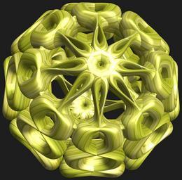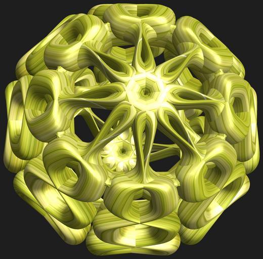 Keywords: mathematica 3d cg parametricplot3d texture torus 輪環 りんかん ドーナツ どーなつ 八芒星 はちぼうせい 八光星 はちこうせい 八稜星 はちりょうせい code program algorithm コード プログラム アルゴリズム geometric sculpture geometricsculpture shape geometry sculpture abstract 抽象 ちゅうしょう アブストラクト design pattern デザイン パターン graphic グラフィック グラフィクス structure 意匠 構造 symmetry 対称性 たいしょうせい シンメトリー 対称 たいしょう algorithm コード indoor black background flower bouquet plant a = 8; (* center hole size of a torus *) b = 8; (* octa-torus *) c = -11; (* distance from the center of rotation *) d = 8; (* number of torus *) h = 2; (* height of a torus *) SetOptions[ParametricPlot3D, PlotRange -> Full, Mesh -> None, Boxed -> False, Axes -> False, PlotPoints -> 400, ImageSize -> 3000, Background -> RGBColor[{30, 30, 30}/255], PlotStyle -> Directive[Specularity[White, 30], Texture[Import["D:/tmp/71.jpg"]]], TextureCoordinateFunction -> ({#4 + #5, #5/Pi} &), Lighting -> "Neutral"]; f[v_] := Sin[2 Sin[Sin[Sin[v]]]]; x = (a - Cos[t] - f[b s]) Cos[s + Pi/(2 b)]; y = (a - Cos[t] - f[b s]) Sin[s + Pi/(2 b)]; z = (a - Sin[t] - h f[b s]) + c; rm = Table[{x, y, z}.RotationMatrix[2 i Pi/d, {1, 0, 0}], {i, d}]; ParametricPlot3D[rm, {t, 0, 2 Pi}, {s, 0, 2 Pi}] (*--- The Texture *) a = 8; (* center hole size of a torus *) b = 8; (* octa-torus *) c = -11; (* distance from the center of rotation *) d = 8; (* number of torus *) h = 2; (* height of a torus *) SetOptions[ParametricPlot3D, PlotRange -> Full, Mesh -> None, Boxed -> False, Axes -> False, PlotPoints -> 400, ImageSize -> 3000, Background -> RGBColor[{30, 30, 30}/255], PlotStyle -> Directive[Specularity[White, 30], Texture[Import["D:/tmp/71.jpg"]]], TextureCoordinateFunction -> ({#4 + #5, #5/Pi} &), Lighting -> "Neutral"]; f[v_] := Sin[2 Sin[Sin[Sin[v]]]]; x = (a - Cos[t] - f[b s]) Cos[s + Pi/(2 b)]; y = (a - Cos[t] - f[b s]) Sin[s + Pi/(2 b)]; z = (a - Sin[t] - h f[b s]) + c; rm = Table[{x, y, z}.RotationMatrix[2 i Pi/d, {1, 0, 0}], {i, d}]; ParametricPlot3D[rm, {t, 0, 2 Pi}, {s, 0, 2 Pi}] (*--- The Texture *) |