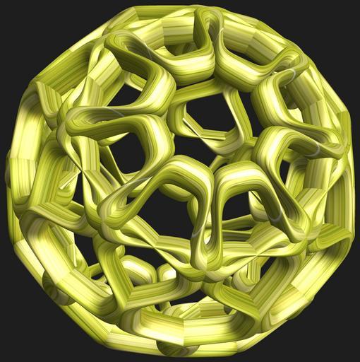 Keywords: mathematica 3d cg parametricplot3d texture torus 輪環 りんかん ドーナツ どーなつ 八芒星 はちぼうせい 八光星 はちこうせい 八稜星 はちりょうせい code program algorithm コード プログラム アルゴリズム geometric sculpture geometricsculpture shape geometry sculpture mapping テクスチャ マッピング 模様 もよう abstract 抽象 ちゅうしょう アブストラクト design pattern デザイン パターン graphic グラフィック グラフィクス structure 意匠 構造 symmetry 対称性 たいしょうせい シンメトリー 対称 たいしょう algorithm コード black background a = 10; (* center hole size of a torus *) b = 8; (* octa-torus *) c = -16; (* distance from the center of rotation *) d = 8; (* number of torus *) h = 2; (* height of a torus *) SetOptions[ParametricPlot3D, PlotRange -> Full, Mesh -> None, Boxed -> False, Axes -> False, PlotPoints -> 400, ImageSize -> 3000, Background -> RGBColor[{30, 30, 30}/255], PlotStyle -> Directive[Specularity[White, 30], Texture[Import["D:/tmp/71.jpg"]]], TextureCoordinateFunction -> ({#4 + #5, #5/Pi} &), Lighting -> "Neutral"]; f[v_] := Sin[2 Sin[Sin[Sin[v]]]]; x = (a - Cos[t] - f[b s]) Cos[s + Pi/(2 b)]; y = (a - Cos[t] - f[b s]) Sin[s + Pi/(2 b)]; z = (a - Sin[t] - h f[b s]) + c; rm = Table[{x, y, z}.RotationMatrix[2 i Pi/d, {1, 0, 0}], {i, d}]; ParametricPlot3D[rm, {t, 0, 2 Pi}, {s, 0, 2 Pi}] (*--- The Texture *) a = 10; (* center hole size of a torus *) b = 8; (* octa-torus *) c = -16; (* distance from the center of rotation *) d = 8; (* number of torus *) h = 2; (* height of a torus *) SetOptions[ParametricPlot3D, PlotRange -> Full, Mesh -> None, Boxed -> False, Axes -> False, PlotPoints -> 400, ImageSize -> 3000, Background -> RGBColor[{30, 30, 30}/255], PlotStyle -> Directive[Specularity[White, 30], Texture[Import["D:/tmp/71.jpg"]]], TextureCoordinateFunction -> ({#4 + #5, #5/Pi} &), Lighting -> "Neutral"]; f[v_] := Sin[2 Sin[Sin[Sin[v]]]]; x = (a - Cos[t] - f[b s]) Cos[s + Pi/(2 b)]; y = (a - Cos[t] - f[b s]) Sin[s + Pi/(2 b)]; z = (a - Sin[t] - h f[b s]) + c; rm = Table[{x, y, z}.RotationMatrix[2 i Pi/d, {1, 0, 0}], {i, d}]; ParametricPlot3D[rm, {t, 0, 2 Pi}, {s, 0, 2 Pi}] (*--- The Texture *) |