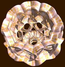 | Keywords: mathematica 3d cg parametricplot3d texture torus 輪環 りんかん ドーナツ どーなつ 五芒星 ごぼうせい 五光星 ごこうせい 五稜星 ごりょうせい code program algorithm コード プログラム アルゴリズム pentagram geometric sculpture geometricsculpture shape geometry sculpture mapping テクスチャ マッピング 模様 もよう abstract 抽象 ちゅうしょう アブストラクト design pattern デザイン パターン graphic グラフィック グラフィクス structure 意匠 構造 symmetry 対称性 たいしょうせい シンメトリー 対称 たいしょう algorithm コード surreal indoor black background a = 5; (* center hole size of a torus *) b = 5; (* penta-torus *) c = 8; (* distance from the center of rotation *) d = 8; (* number of torus *) h = 1; (* height of a torus *) SetOptions[ParametricPlot3D, PlotRange -> Full, Mesh -> None, Boxed -> False, Axes -> False, PlotPoints -> 400, ImageSize -> 1600, Background -> Darker[Orange, 0.8], PlotStyle -> Directive[Specularity[White, 30], Texture[Import["D:/tmp/861.jpg"]]], TextureCoordinateFunction -> ({#4, #5 2 Pi} &), Lighting -> "Neutral"]; f[v_] := Sin[2 Sin[Sin[Sin[v]]]]; g[v_] := Sum[Cos[(2 k - 1) v]/(2 k - 1), {k, 4}]; x = (a - g[t] - f[b s]) Cos[s + 3 Pi/(4 b)] + c; y = (a - g[t] - f[b s]) Sin[s + 3 Pi/(4 b)] + c; z = (a - Sin[t] - h f[b s]); rot = Table[{x, y, z}.RotationMatrix[2 i Pi/d, {1, 1, 1}], {i, d}]; ParametricPlot3D[rot, {t, 0, 2 Pi}, {s, 0, 2 Pi}] (*--- The Texture *) a = 5; (* center hole size of a torus *) b = 5; (* penta-torus *) c = 8; (* distance from the center of rotation *) d = 8; (* number of torus *) h = 1; (* height of a torus *) SetOptions[ParametricPlot3D, PlotRange -> Full, Mesh -> None, Boxed -> False, Axes -> False, PlotPoints -> 400, ImageSize -> 1600, Background -> Darker[Orange, 0.8], PlotStyle -> Directive[Specularity[White, 30], Texture[Import["D:/tmp/861.jpg"]]], TextureCoordinateFunction -> ({#4, #5 2 Pi} &), Lighting -> "Neutral"]; f[v_] := Sin[2 Sin[Sin[Sin[v]]]]; g[v_] := Sum[Cos[(2 k - 1) v]/(2 k - 1), {k, 4}]; x = (a - g[t] - f[b s]) Cos[s + 3 Pi/(4 b)] + c; y = (a - g[t] - f[b s]) Sin[s + 3 Pi/(4 b)] + c; z = (a - Sin[t] - h f[b s]); rot = Table[{x, y, z}.RotationMatrix[2 i Pi/d, {1, 1, 1}], {i, d}]; ParametricPlot3D[rot, {t, 0, 2 Pi}, {s, 0, 2 Pi}] (*--- The Texture *) |