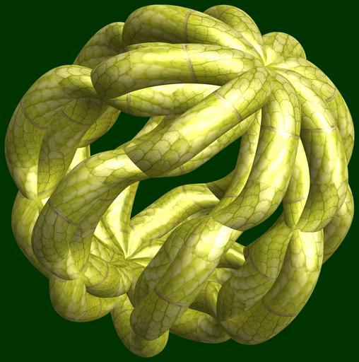 Keywords: mathematica 3d cg parametricplot3d texture torus 輪環 りんかん ドーナツ どーなつ 三芒星 さんぼうせい 三光星 さんこうせい 三稜星 さんりょうせい code program algorithm コード プログラム アルゴリズム geometric sculpture geometricsculpture shape geometry sculpture mapping テクスチャ マッピング 模様 もよう abstract 抽象 ちゅうしょう アブストラクト design pattern デザイン パターン graphic グラフィック グラフィクス structure 意匠 構造 symmetry 対称性 たいしょうせい シンメトリー 対称 たいしょう algorithm コード black background organic pattern foliage plant a = 8; (* center hole size of a torus *) b = 3; (* tri-torus *) c = -8; (* distance from the center of rotation *) d = 8; (* number of torus *) h = 1; (* height of a torus *) SetOptions[ParametricPlot3D, PlotRange -> Full, Mesh -> None, Boxed -> False, Axes -> False, PlotPoints -> 400, ImageSize -> 3000, Background -> Darker[Green, 0.8], PlotStyle -> Directive[Specularity[White, 30], Texture[Import["D:/tmp/71.jpg"]]], TextureCoordinateFunction -> ({#4, #5 b Pi} &), Lighting -> "Neutral"]; f[v_] := Sin[2 Sin[Sin[Sin[v]]]]; x = (a - Cos[t] - f[b s]) Cos[s + Pi/b]; y = (a - Cos[t] - f[b s]) Sin[s + Pi/b]; z = (a - Sin[t] - h f[b s]) + c; rm = Table[{x, y, z}.RotationMatrix[2 i Pi/d, {1, 0, 0}], {i, d}]; ParametricPlot3D[rm, {t, 0, 2 Pi}, {s, 0, 2 Pi}] (*--- The Texture *) a = 8; (* center hole size of a torus *) b = 3; (* tri-torus *) c = -8; (* distance from the center of rotation *) d = 8; (* number of torus *) h = 1; (* height of a torus *) SetOptions[ParametricPlot3D, PlotRange -> Full, Mesh -> None, Boxed -> False, Axes -> False, PlotPoints -> 400, ImageSize -> 3000, Background -> Darker[Green, 0.8], PlotStyle -> Directive[Specularity[White, 30], Texture[Import["D:/tmp/71.jpg"]]], TextureCoordinateFunction -> ({#4, #5 b Pi} &), Lighting -> "Neutral"]; f[v_] := Sin[2 Sin[Sin[Sin[v]]]]; x = (a - Cos[t] - f[b s]) Cos[s + Pi/b]; y = (a - Cos[t] - f[b s]) Sin[s + Pi/b]; z = (a - Sin[t] - h f[b s]) + c; rm = Table[{x, y, z}.RotationMatrix[2 i Pi/d, {1, 0, 0}], {i, d}]; ParametricPlot3D[rm, {t, 0, 2 Pi}, {s, 0, 2 Pi}] (*--- The Texture *) |